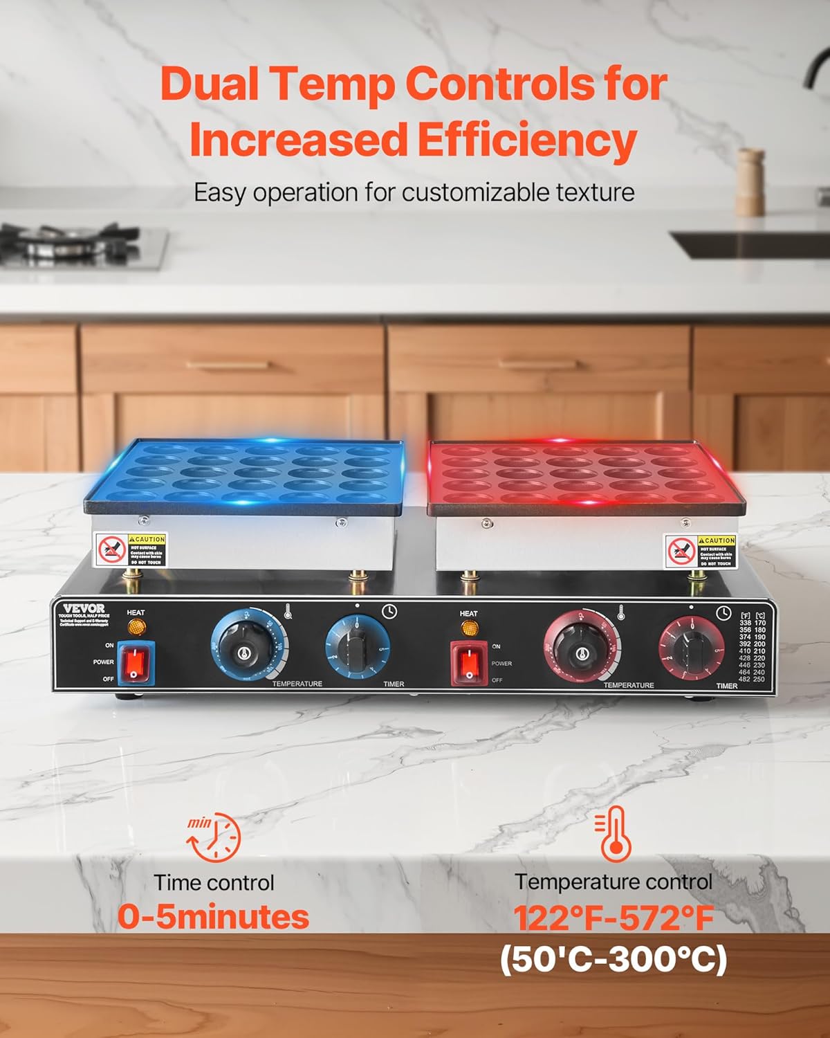 VEVOR 50PCS Mini Dutch Pancake Maker, Non-stick Stainless Steel Dorayaki Baker, 1800W Commercial Electric Poffertjes Grill Pan, Dual Temp & Time Control, for Kitchen Restaurant Breakfast Dessert