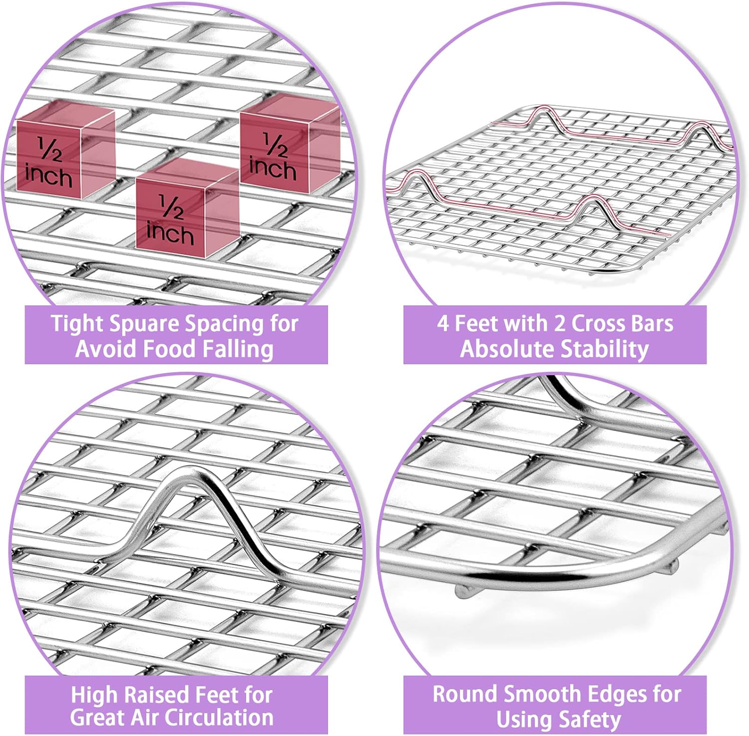 • 【Our Advantages】The corrugated bottom extend space under food, Allow more airs circulate around the food and the pan, Ensure quick and even heating, By the way, less contact surface between the bottom and food for less sticking risks, Each baking racks with ½” x ½” grid spacing can keep food from falling through, Solid construction with thick outer frame and cross bars, Ensure a great load-bearing and absolute stability