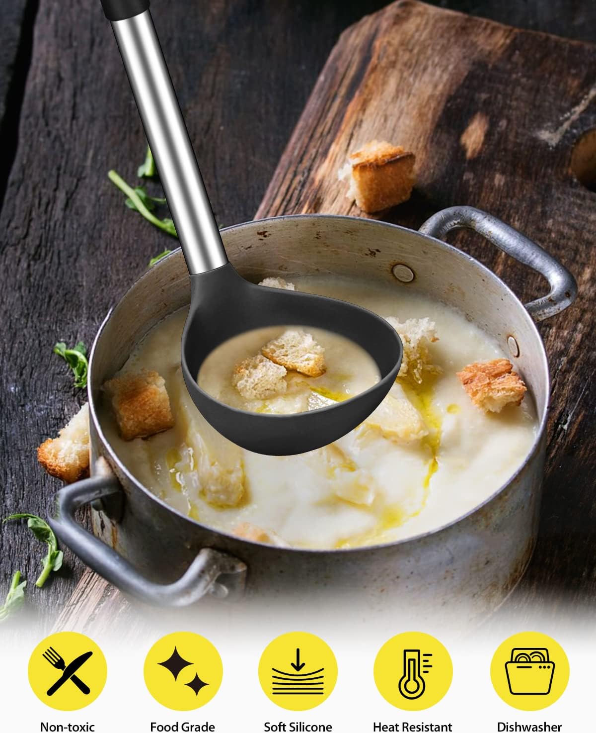 Silicone Pasta Fork and Soup Ladle Set, Non-Stick BPA Free Heat-Resistant Handy Kitchen Utensils for Cooking, Serving, Draining, Stirring (Black)
