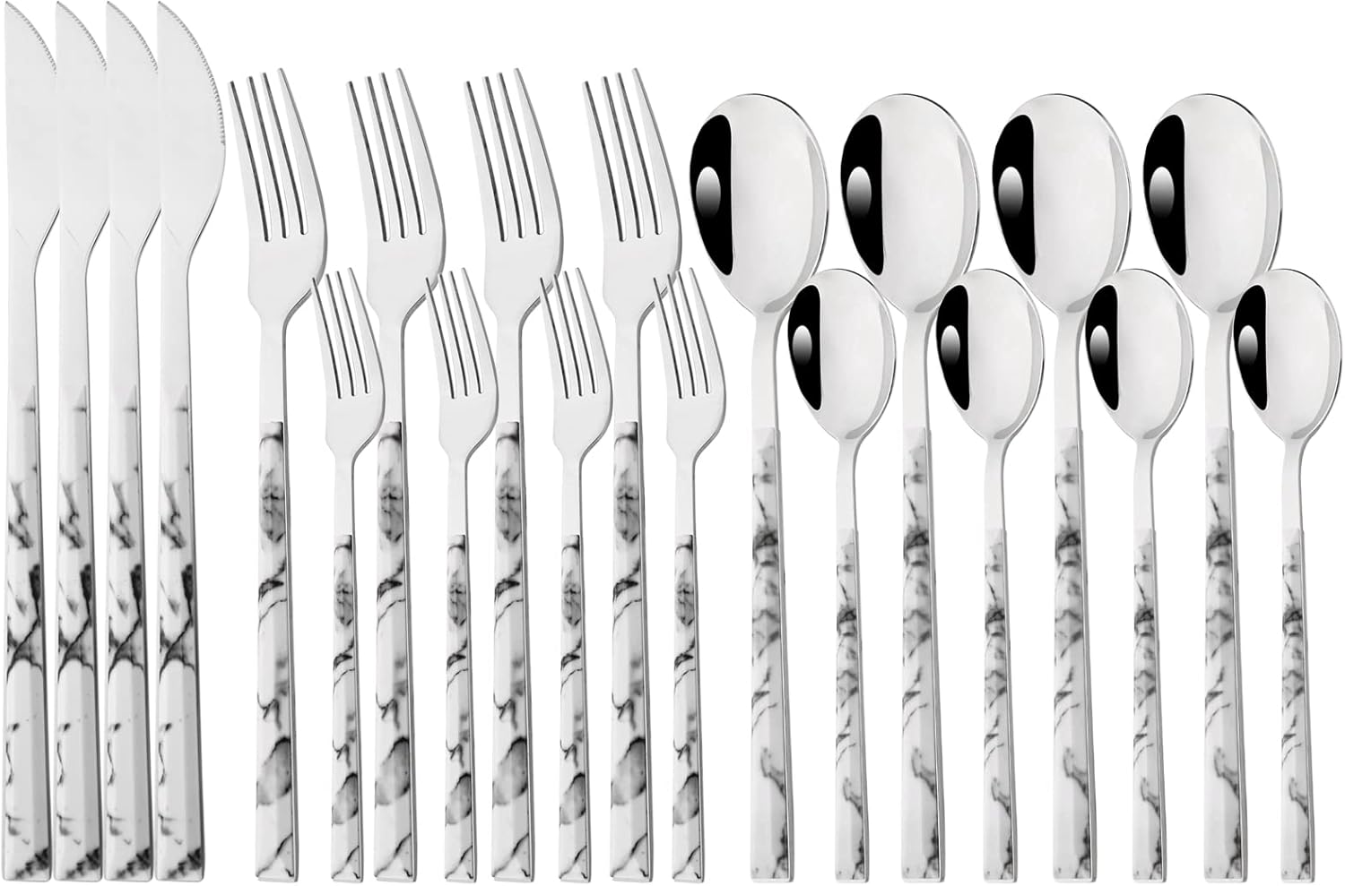 20 Piece (4 Set) Silver Stainless Steel Tableware With White Marble Handle, Wedding Cutlery And Daily Use, Silverware For Home Restaurant Party, Mirror Finished