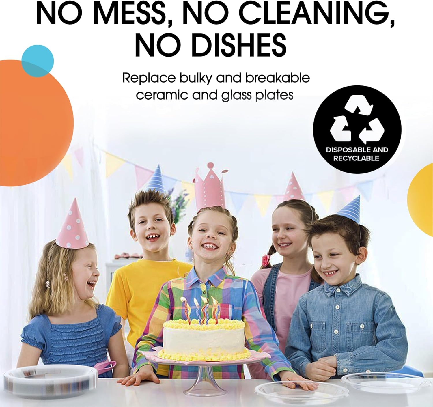 • Health & Safety: Our clear plastic plate set is made with food-safe materials, ensuring the health and safety of your guests. Whether it's for a birthday party or a picnic, you can trust that these disposable plastic plates meet the highest standards of hygiene, providing peace of mind for you and your loved ones.