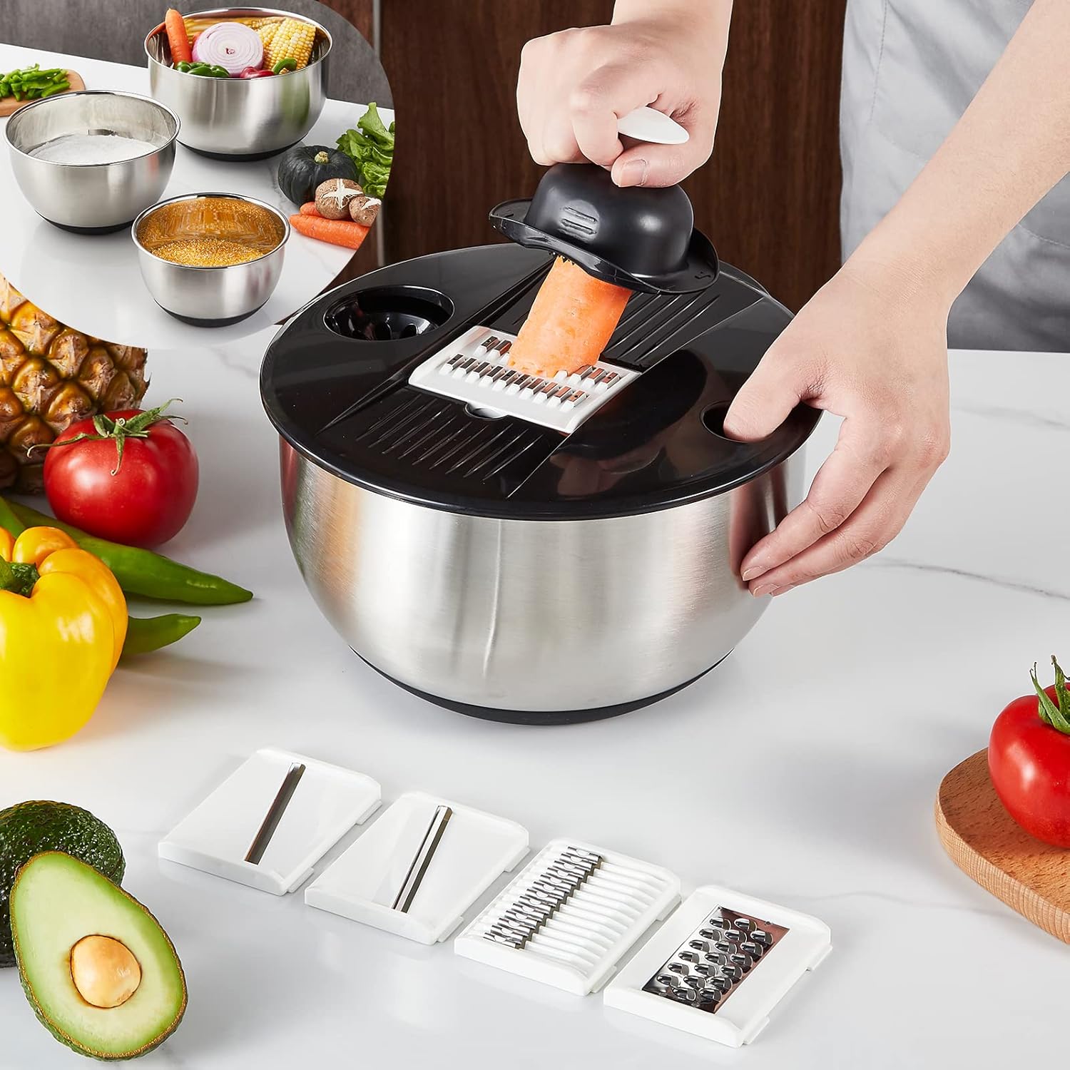 • 🔥[Various Sizes for Everyday Use]-Including 3 stainless steel mixing bowls with the size of 1.5qt, 3qt and 5qt, one used for cooking lid and another 2 for storage.This essentials set can cover the basic needs of your kitchen.