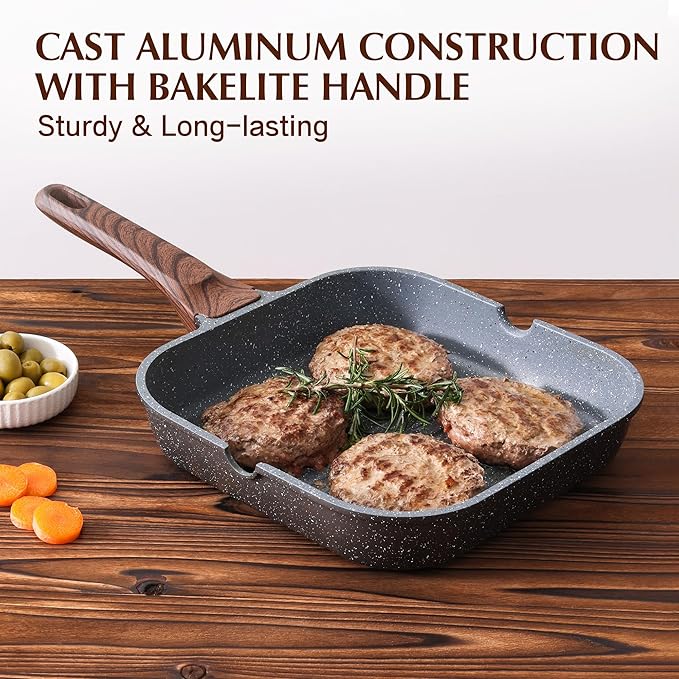• Sturdy & Durable: This grill pan is made of die cast aluminum, stury and no warp. The bakelite handle features comfortable to grip and stays cool to the touch.