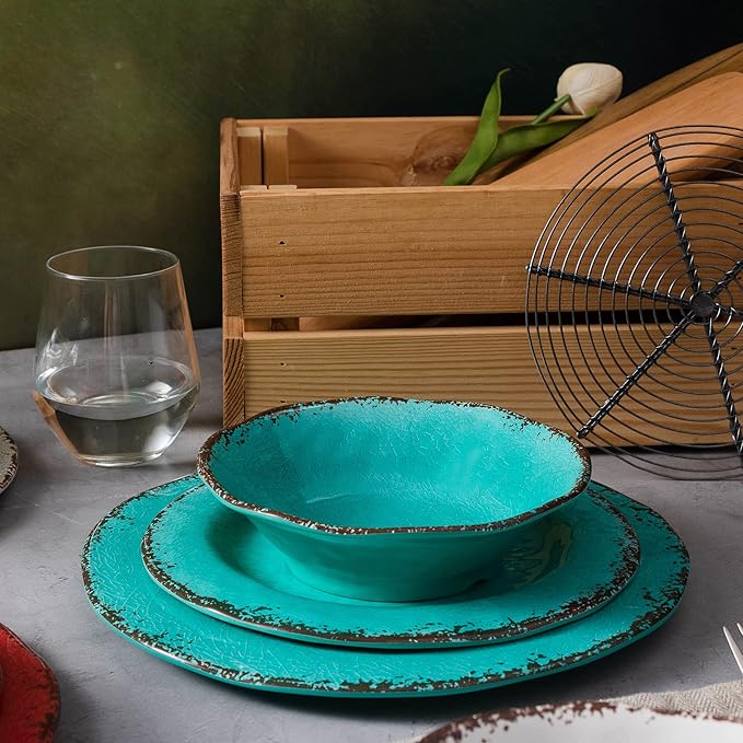 LEHAHA BPA Free Rustic Melamine Plate and Bowl Dinnerware Set Perfect for Indoor Outdoor Dining Party, Camping, 12 Piece Unbreakable Dinnerware Set, Service for 4