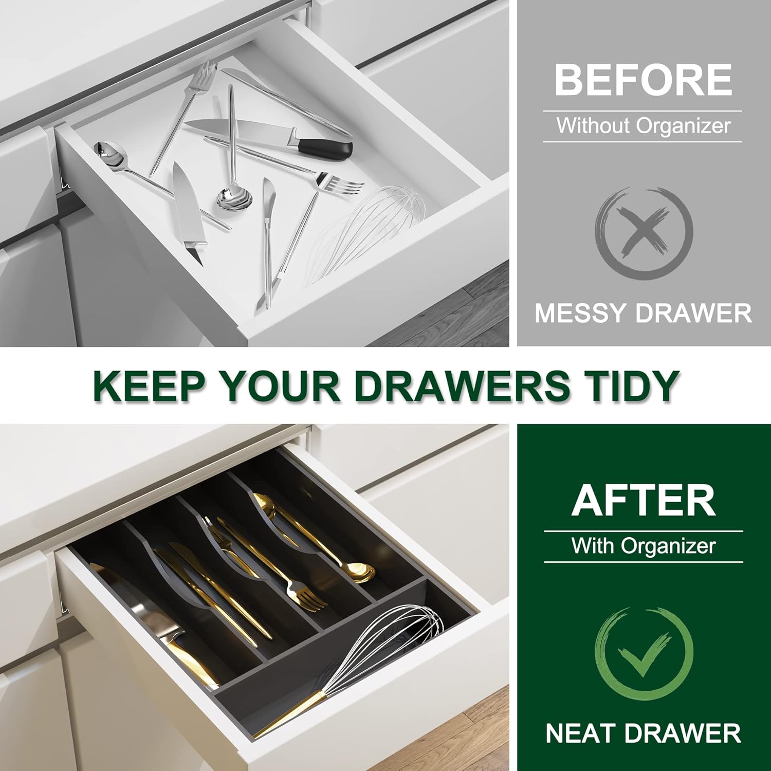 • 【Keep all you need at hand】Stop worrying about finding utensils when you cook. 5 deep compartments make our silverware organizer a good assistant for cooking. When all every cutlery is neatly arranged in our drawer cooking is also become easier. Clear your flatware & utensil and enjoy cooking with a cheerful heart.