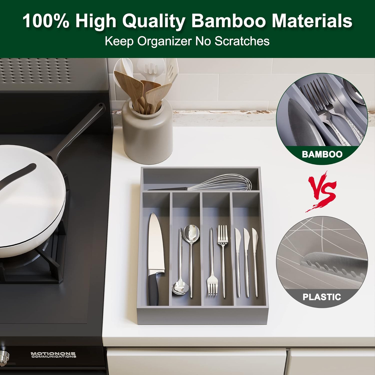 • ✅【MADE OF NATURAL BAMBOO】Our flatware organizer is made of natural bamboo. The material is taken from bamboo that have grown for more than 4 years which make our silverware holder for drawer use a durable kitchen piece that ll last you for years. The Environmentally material keep our flatware & utensil water and odor resistant. Even the knife won't leave scratch on it.