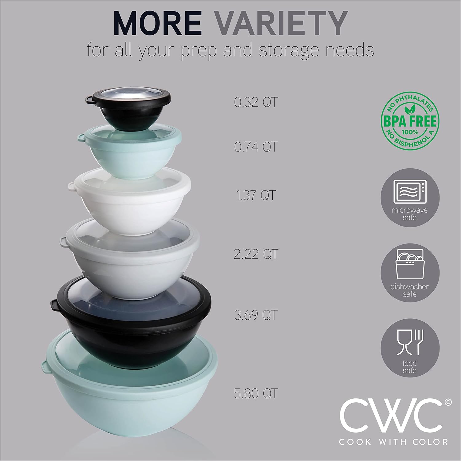• Set includes 6 plastic bowls and 6 TPR lids; Bowl capacity of 0.32 QT, 0.74 QT, 1.37 QT, 3.69 QT and 5.8 QT.
