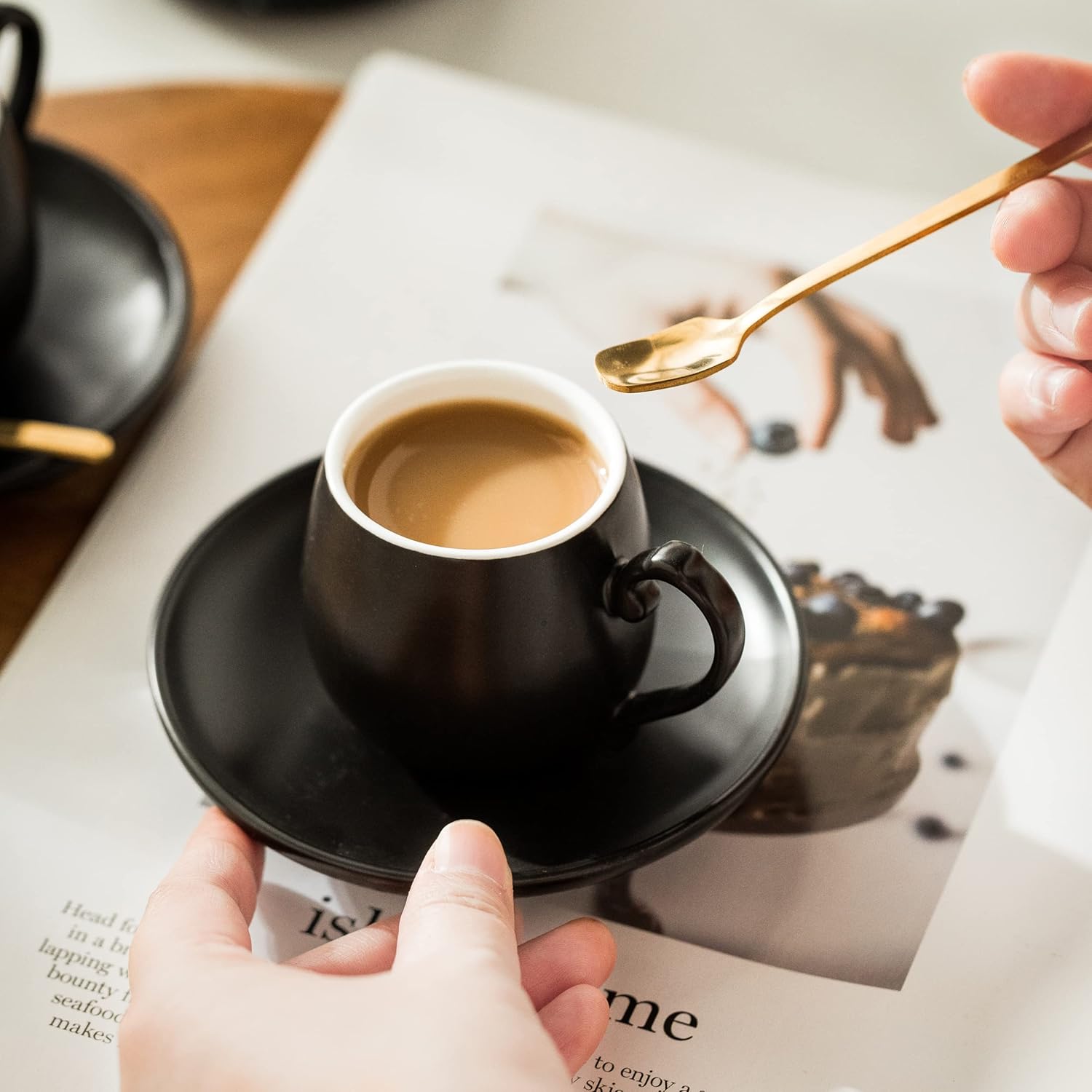 • The espresso coffee cup and saucer set with matted design style is delicate and elegant. The porcelain espresso cups and saucers set is ideal for that morning single-shot or double shot of espresso, or to enjoy a dessert time or tea time. The saucer easily holds your coffee cup, coffee scoop, or sugar packet. The beautiful spoon will give you a pleasant feeling when drinking tea or coffee.