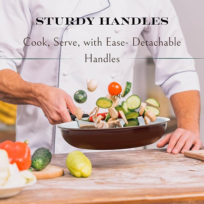 • Durable Nonstick Cookware Set: Our kitchen pots and pans set is made from top materials, thicker aluminum, more durable & stable. The edges are smooth to ensure the detachable handles are tightly held and safe. Our kitchen cookware sets are non-toxic and free from PTFE & PFOA.
