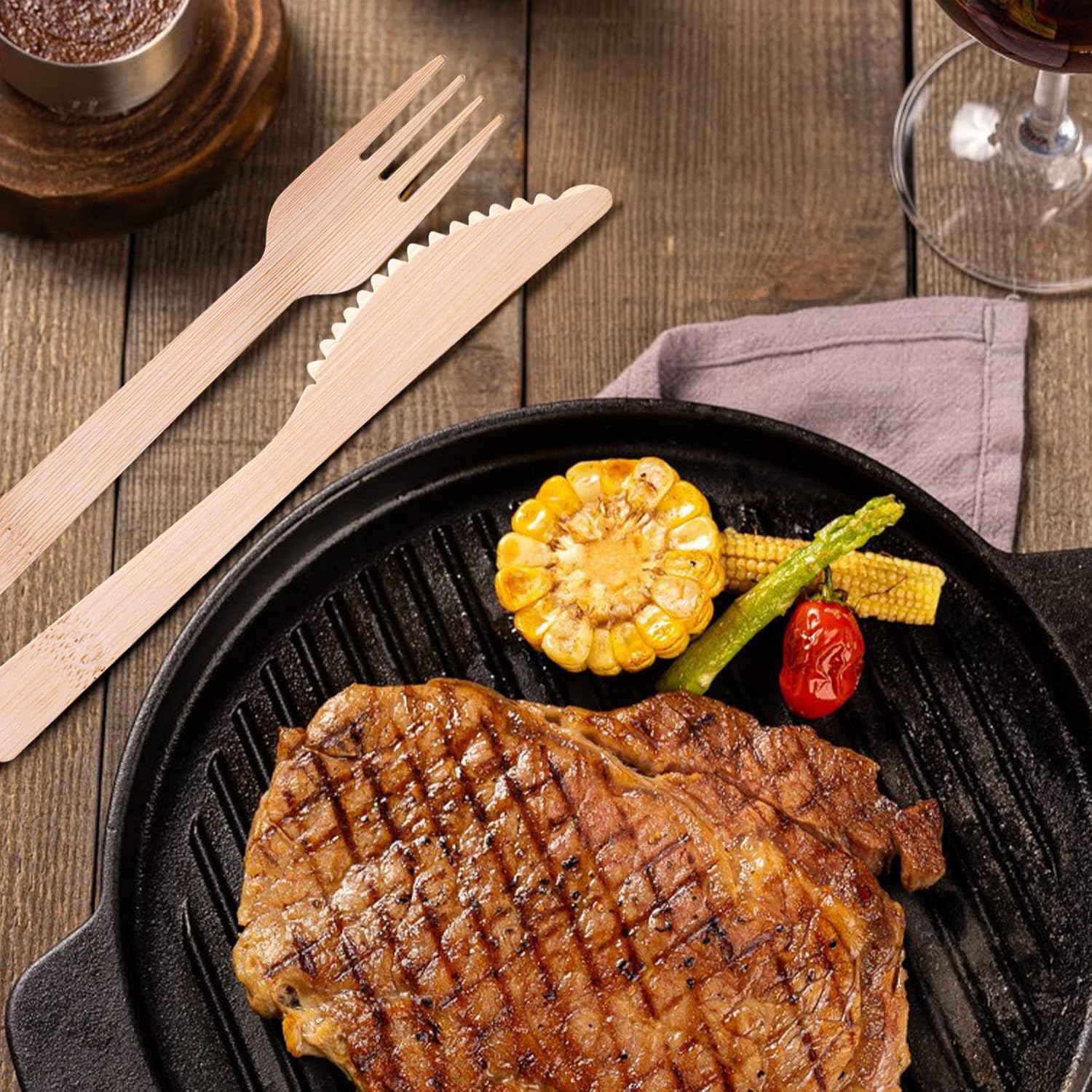 • ✔[ Sturdy & Durable] All our bamboo forks, spoons and knives are polished to perfect smoothness, splinter free, containing no harmful chemicals, no flavour, heavy duty, liquid and heat resistant, more durable and sustainable than wooden. Because of these features, you can enjoy your meal without worry the break like flimsy disposable wooden cutlery. No wood taste or no softening.