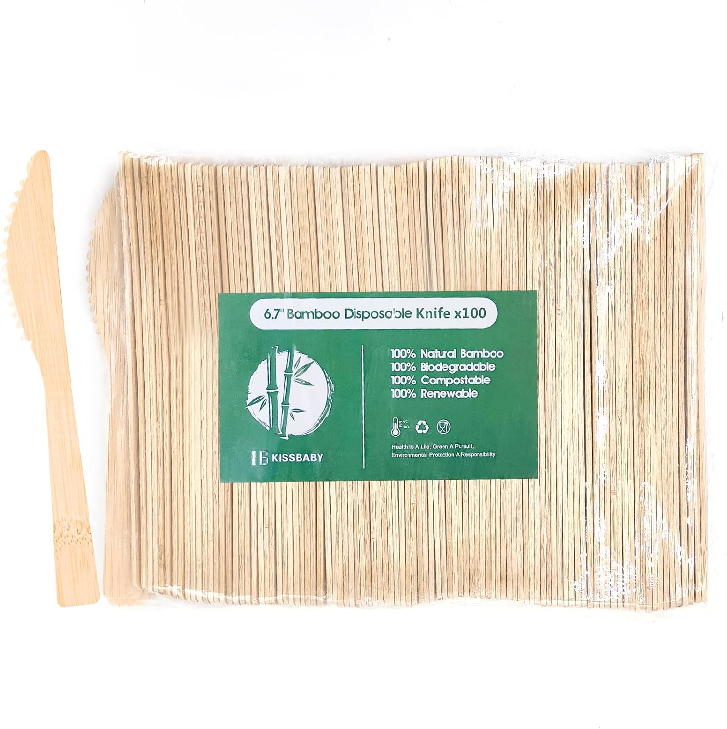 • ✔[ What Is Included] Our bamboo utensil set include 100pcs bamboo Knives, all length in 6.7inch that sized to mimic traditional silverware. Our eco friendly cutlery are carefully crafted to allow for a firm grip while cutting or scooping through tough foods. flavorless and odorless, you can enjoy your food with peace of mind.