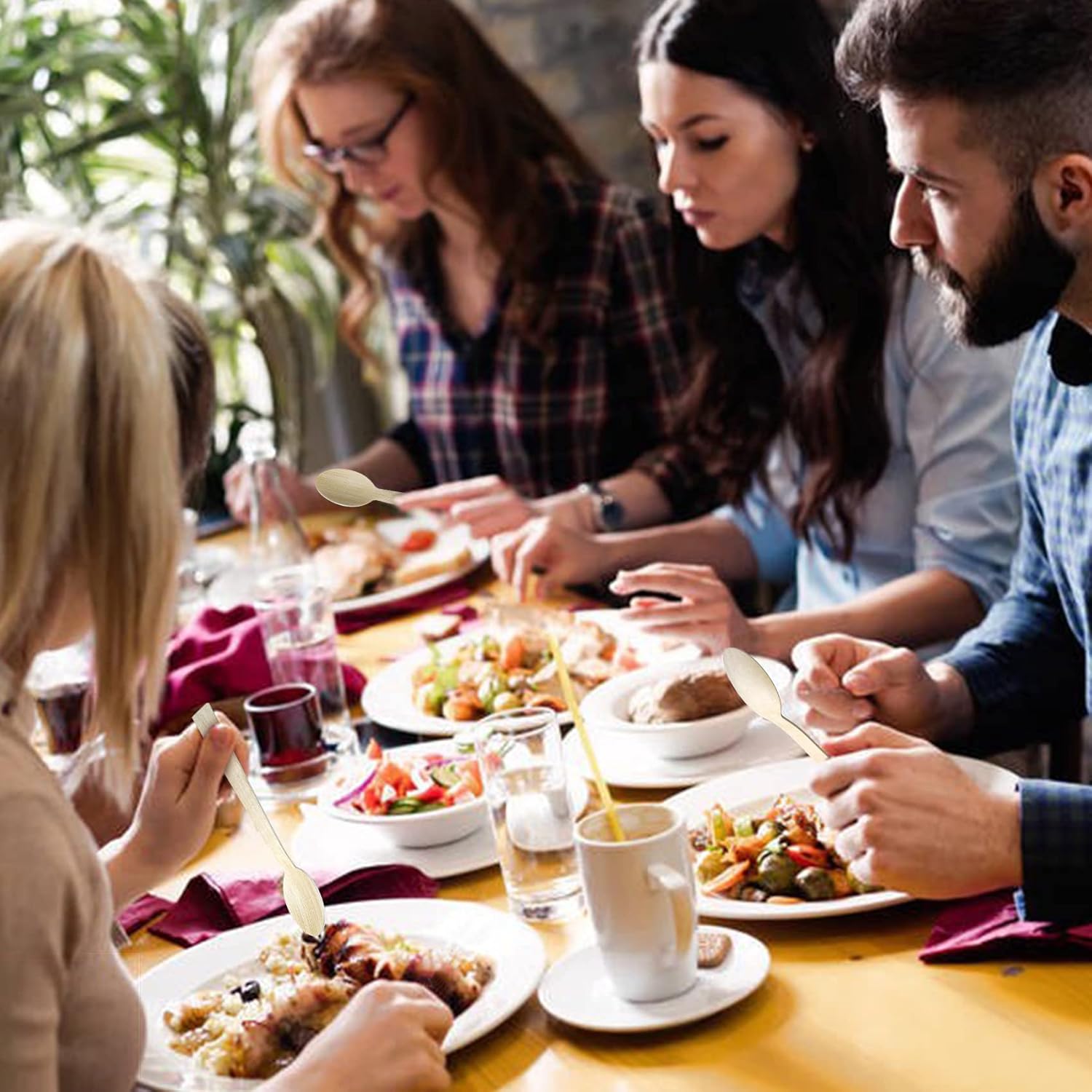 • ✔[100% Natural] Enjoy your food with 100% Bamboo Compostable Utensils made in a certified facility. This renewable resource is grown and harvested to reduce deforestation. No BPA or Toxic Chemicals that may be found in disposable plastic utensils. TREE FREE means you don’t have to promote cutting down trees to provide your guests elegantly durable wooden utensils. Perfect for most breakfast, lunch and dinner settings.