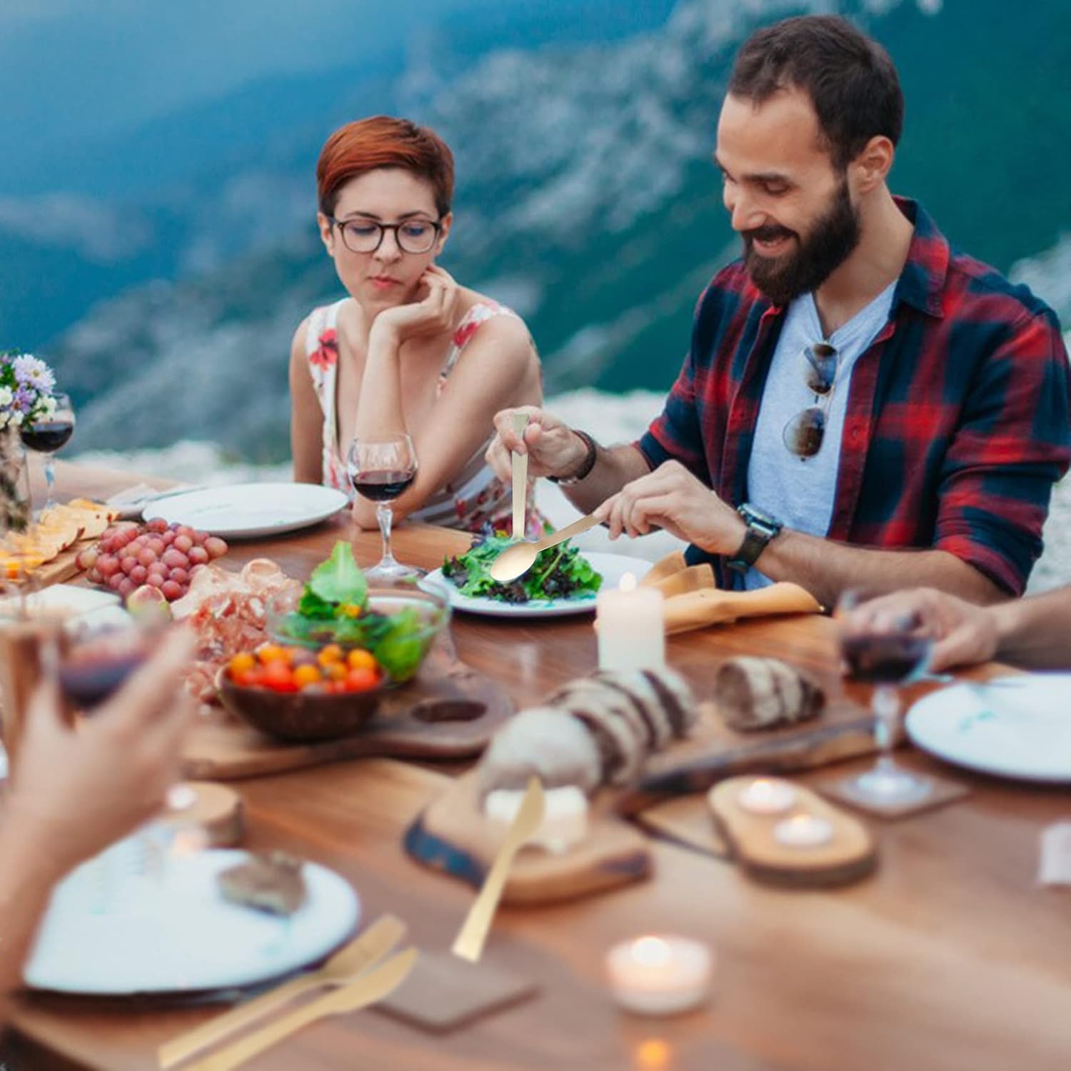 • ✔[Multi-Occasion Applications ] Bamboo Utensil set provide convenience without compromise. No cutlery clean-up. Simplify meals and hosting. Spend more time with your friends and family. The bamboo disposable utensils are not only suitable and convenient for everyday use like breakfast, lunch and dinner, restaurants, school, but also perfect for travelling, camping, picnic, catering, BBQs, party, wedding, birthday, New Year's Eve, housewarmings, and anniversaries.