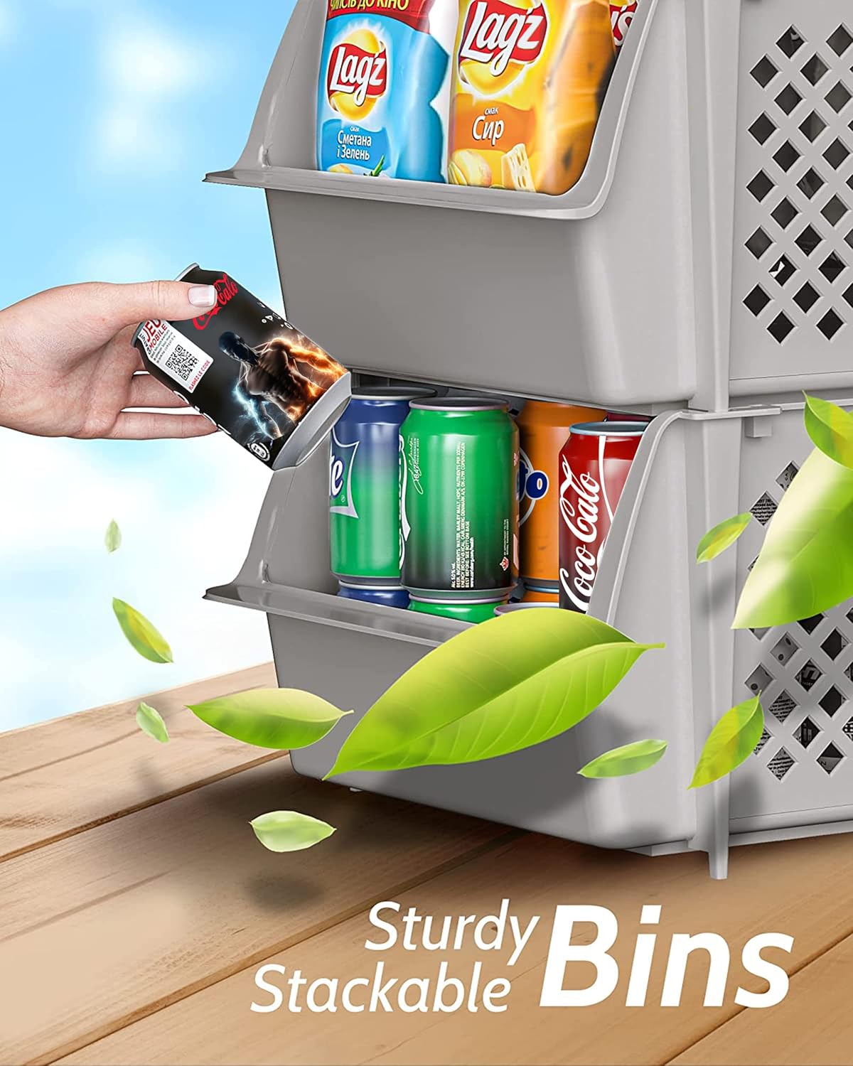TidyFriend Stackable Storage Bins for Pantry, 4 Pack Stackable Bins For Organizing Food, Kitchen, and Bathroom Essentials (Light Grey)
