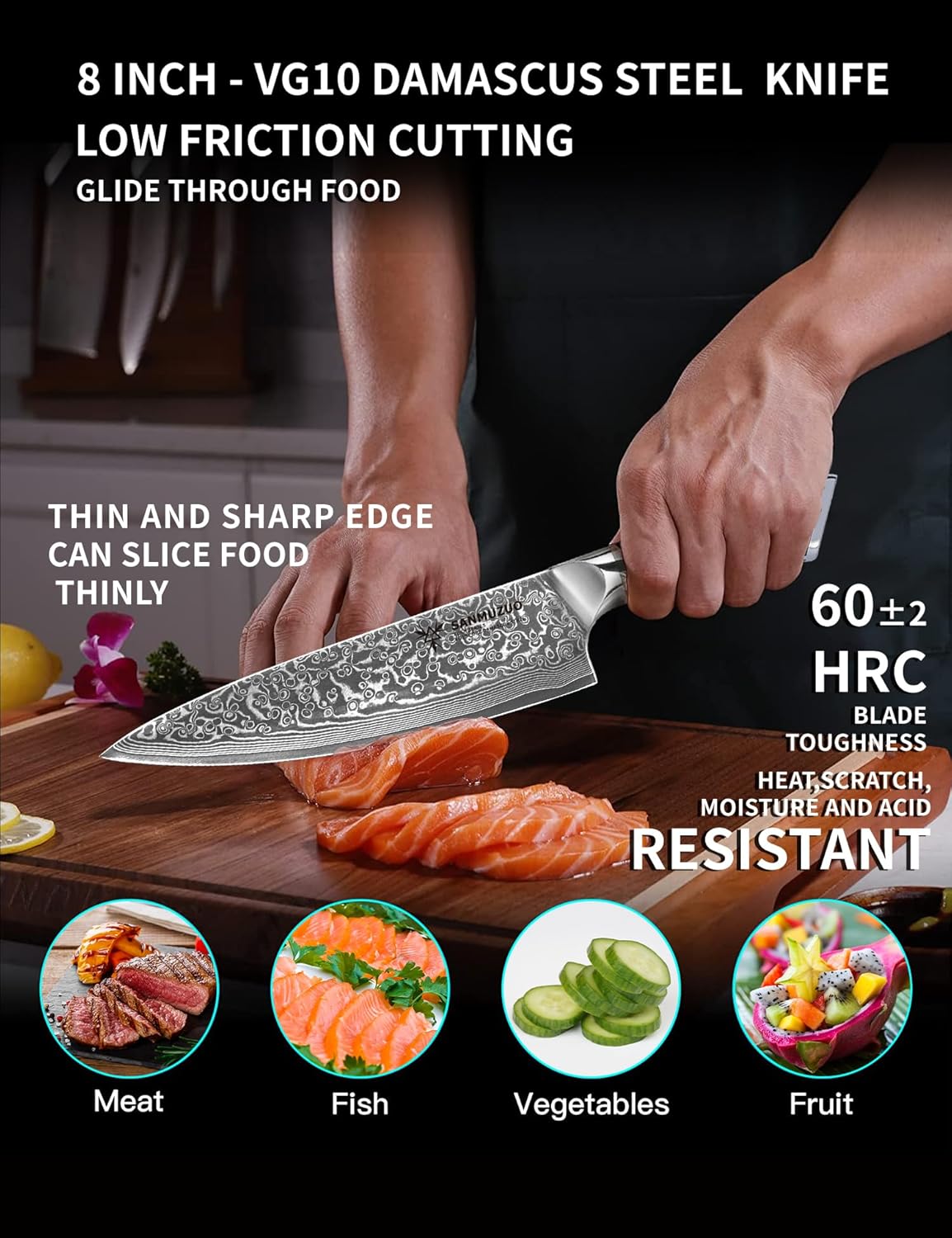 • Use: The ultra-sharp edges are perfect for shredding, slicing and dicing for vegetables, fish, cheese or meat, the possibilities are endless! Packaged in a luxurious gift box, the SANMUZUO 8" Kitchen Knife is the perfect gift for home cooks and professional chefs