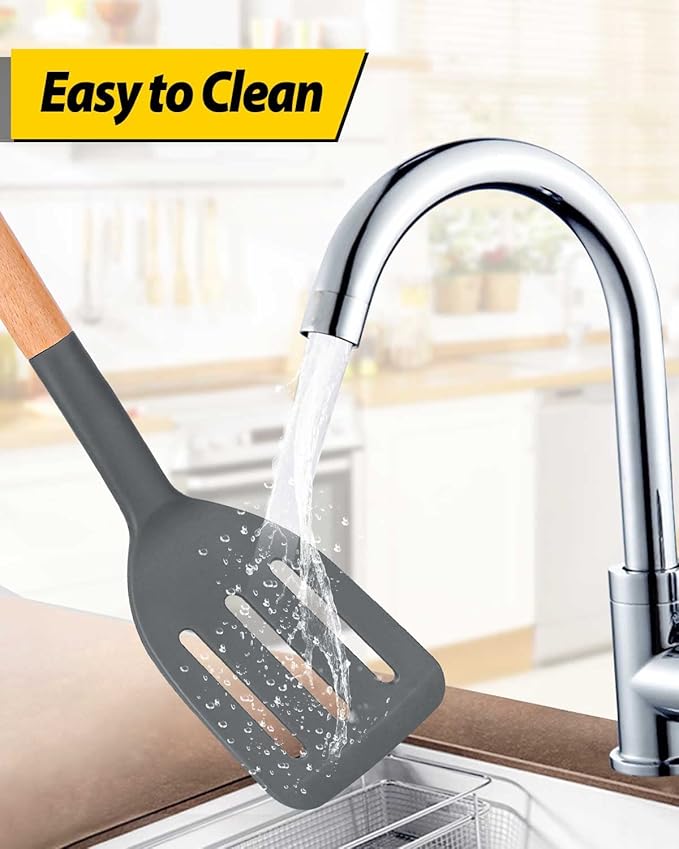 Pack of 2 Silicone Cooking Spatula, Heat Resistant Solid Turner, Non Stick Slotted Spatulas with Wooden Short Handle,Ideal Wood Kitchen Utensils Set for Frying, Baking, Flipping, Turning