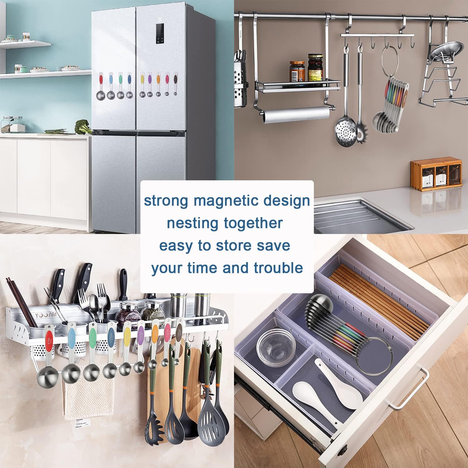 • [Magnetic Design]: Each measuring spoon has magnetic handles keep Spoons together for easy tightly stacks together in the drawer . These measuring spoons store easily and stay together, strong Magnetic do the job to keep these neatly in the drawer.you can quickly grab the measuring spoon you need without.