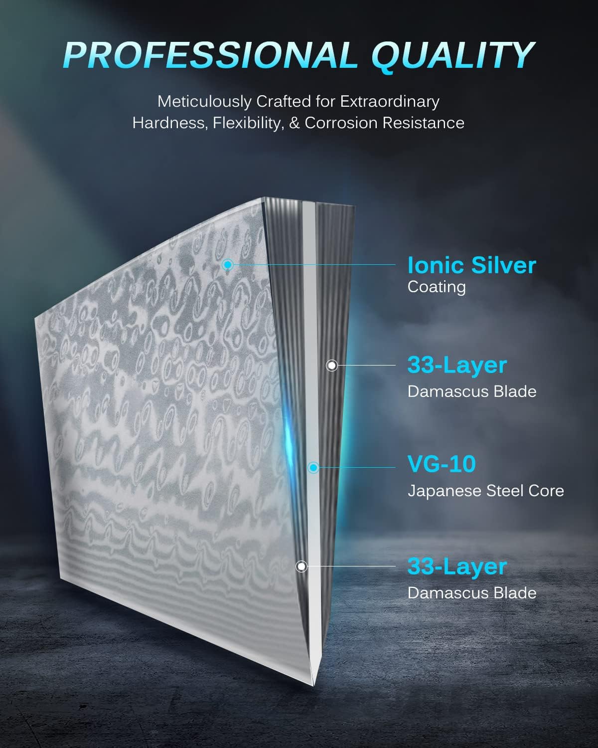 • INNOVATIVE PROTECTION: Our blade boasts a protective silver ion coating to prevent growth of unwanted contaminants for extra culinary safety; the provided sheath and case allow you to preserve your knife with care