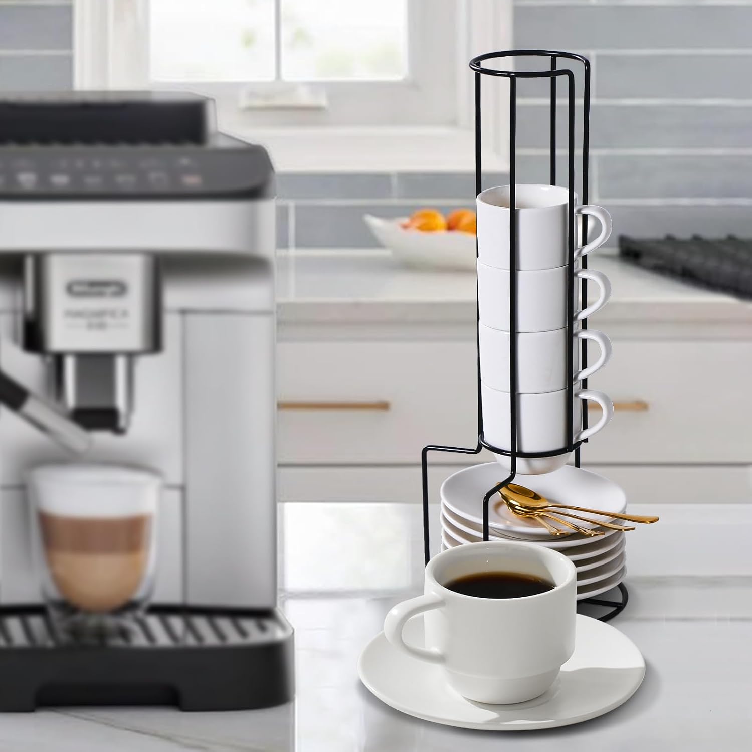 Lareina Porcelain Stackable Espresso Cups with Saucers, Spoons and Metal Stand, 3 Ounce Small Coffee Cups Set of 6 - Ceramic Demitasse Mugs, White