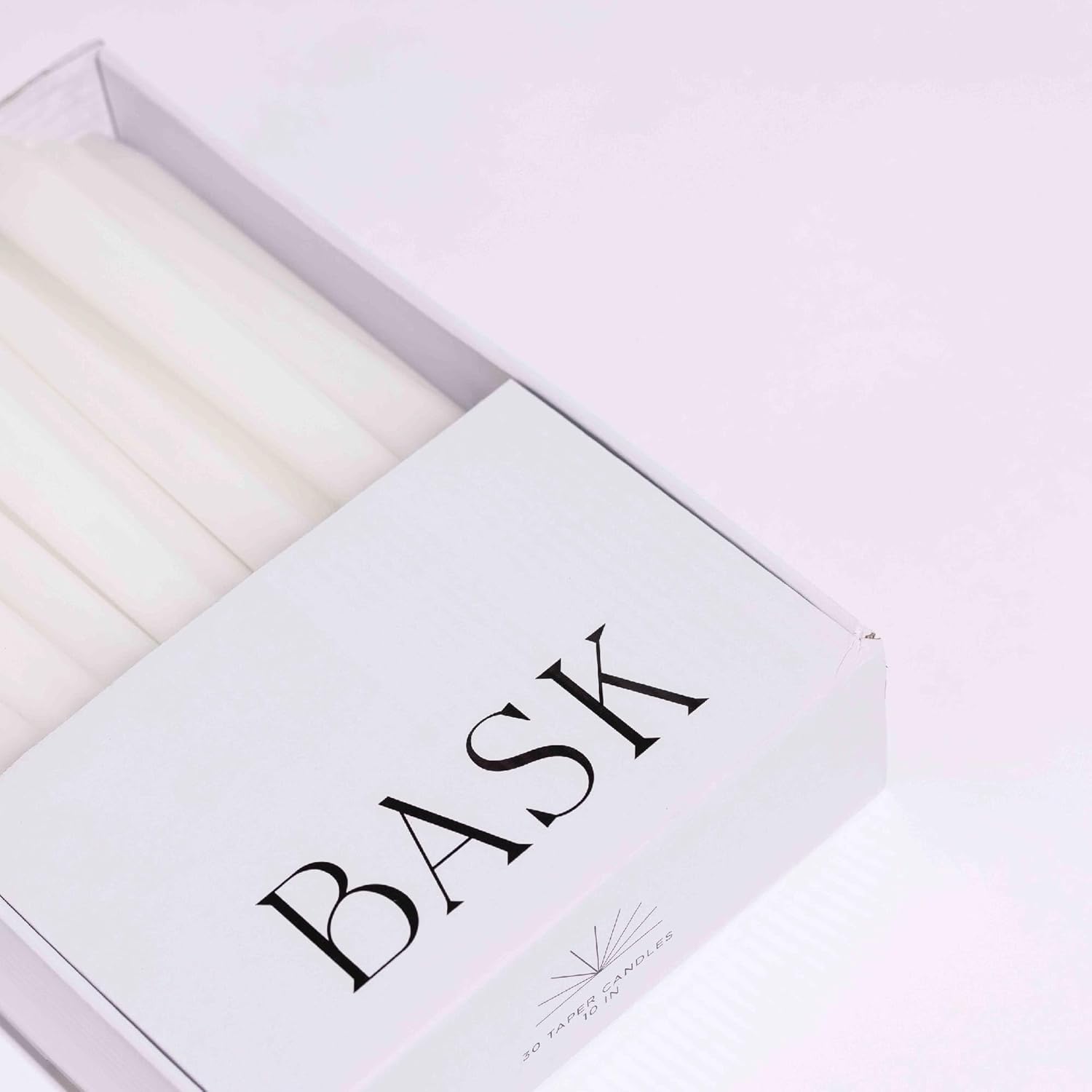 Bask 10-inch Taper Candles - Unscented and Dripless - Burns for 8 Hours - Home Decor for Dinner Table, Kitchen, and Bedroom - Perfect for a Romantic Date or Anniversary - 30-Pack - Ivory