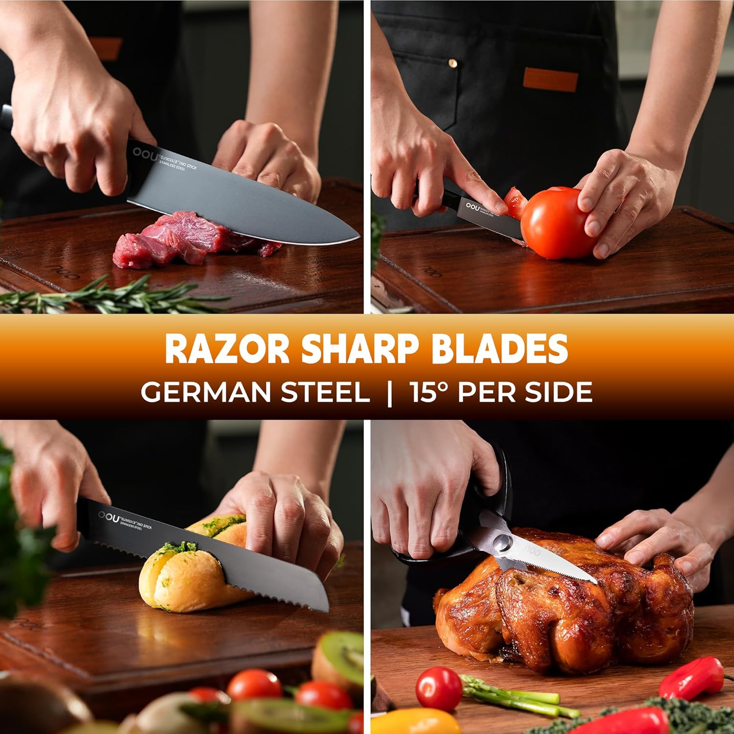 OOU Kitchen Knife Block Set - 15 Pieces High Carbon Stainless Steel Chef Knife Sets, Anti-Rust Black Knives Set with Built-in Sharpener Block, Black