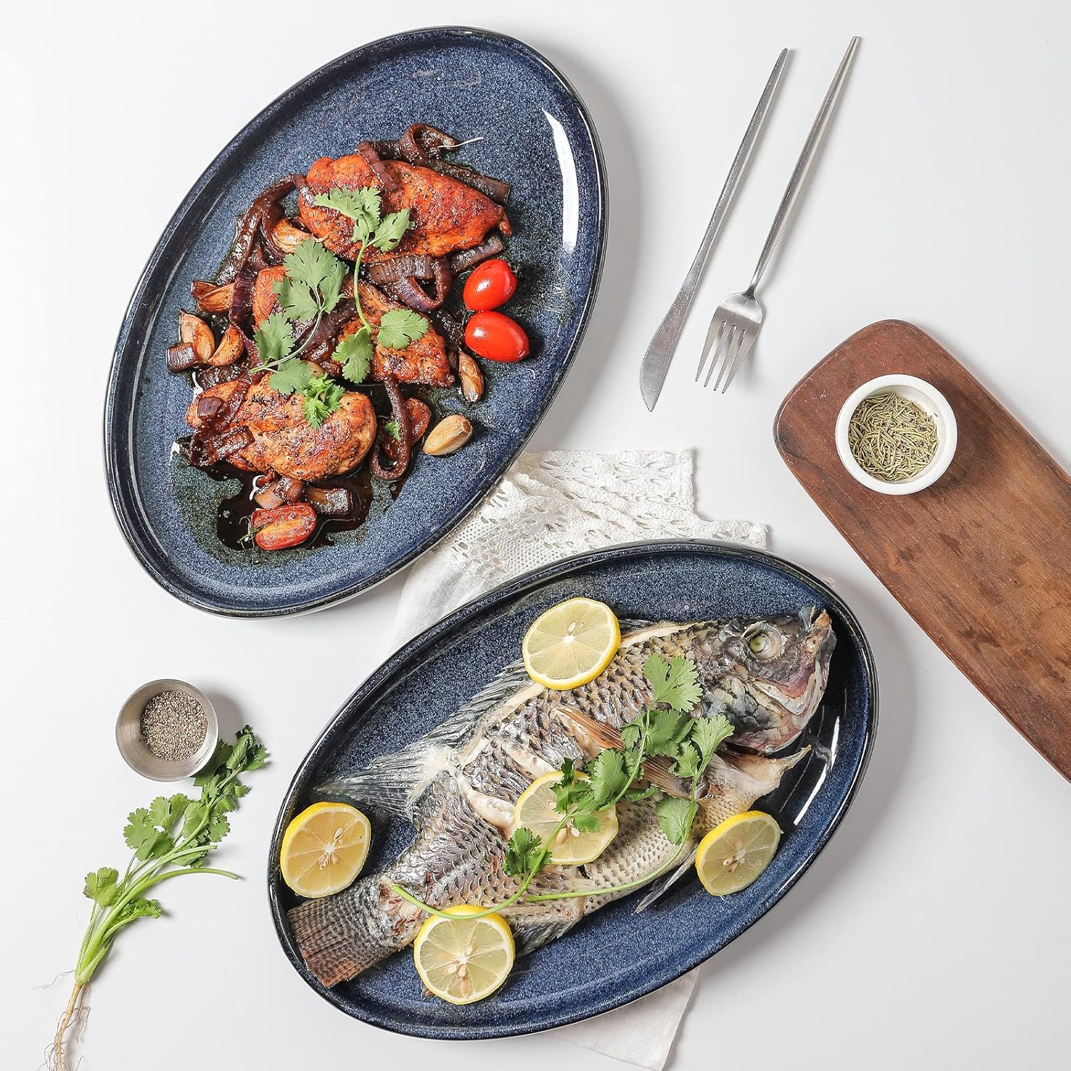 • MICROWAVE OVEN PROOF: These serving trays are made of durable porcelain, chip-resistant and more sturdy than stoneware, oven safe to 590°F, and the oval ceramic serving grill platter be used in the oven, microwave, refrigerator and dishwasher