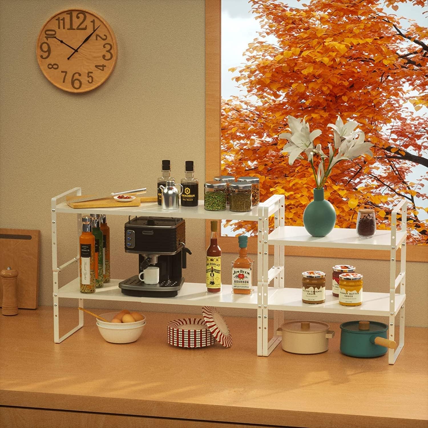 • 【DURABLE &STRONG】:Cabinet Shelf Organizers is made of sturdy metal with anti rust coating,there is a metal support rod in the middle of these cabinet shelves,it can ensures the shelf didn’t get collapse when you place some heavy items on it,the screws at the metal rod are can be loose or tight to expand the countertop shelves