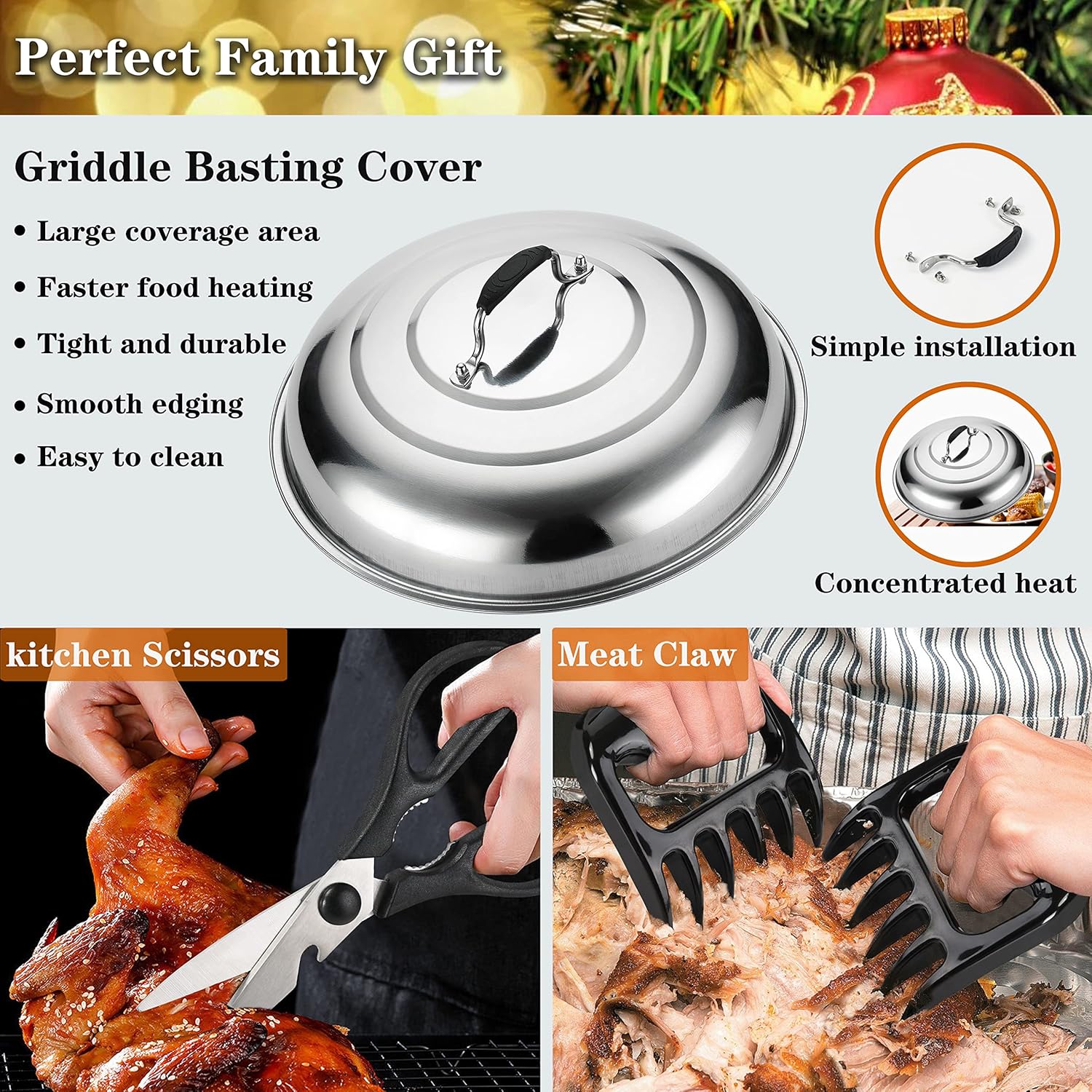 • THE MOST PRACTICAL GRIDDLE ACCESSORIES - The grill dome is ideal for concentrating heat to cook meat evenly, to melt cheese or to steam vegetables. Grill press is large enough to flattens the bacon, keeping its shape for even cooking. Shredding meat is a breeze with our meat claws. Also coming with ultra sharp&all-purpose kitchen scissors and heat-resistant silicone grill glove for most kitchen tasks.