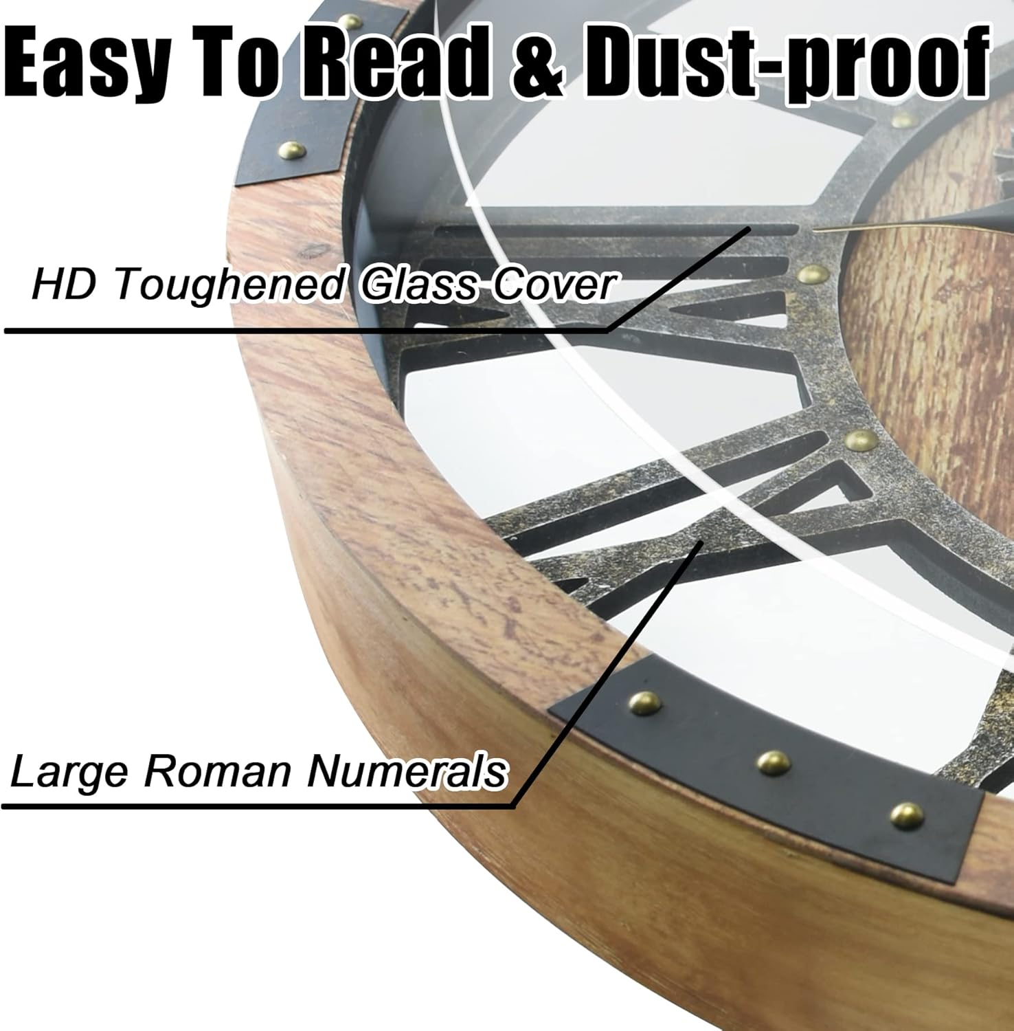 • Oversized Clock and Silent Movement: This farmhouse wall clock measures 24" (60CM) in diameter, 2.95'' (7.5CM) in depth, weight-10.12lbs (4.6kg), big size and heavy duty. Using high quality quartz movement material to run smoothly, ensuring accurate timing and absolute silence. Big Roman Numerals, HT toughened glass cover, you can easily read the time from any angle