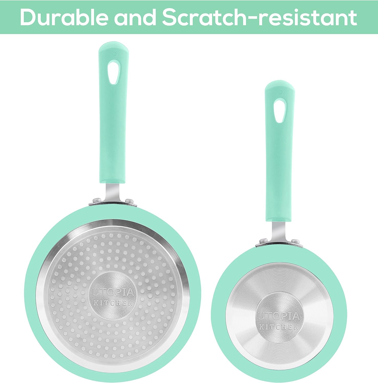 • Set of 2 – The set comprises of one 1-quart stock pot saucepan and one 2-quart saucepan; the pans carry a thickness of 3 mm with a 2-layer non-stick coating inside and heat-resistant paint on the outside.