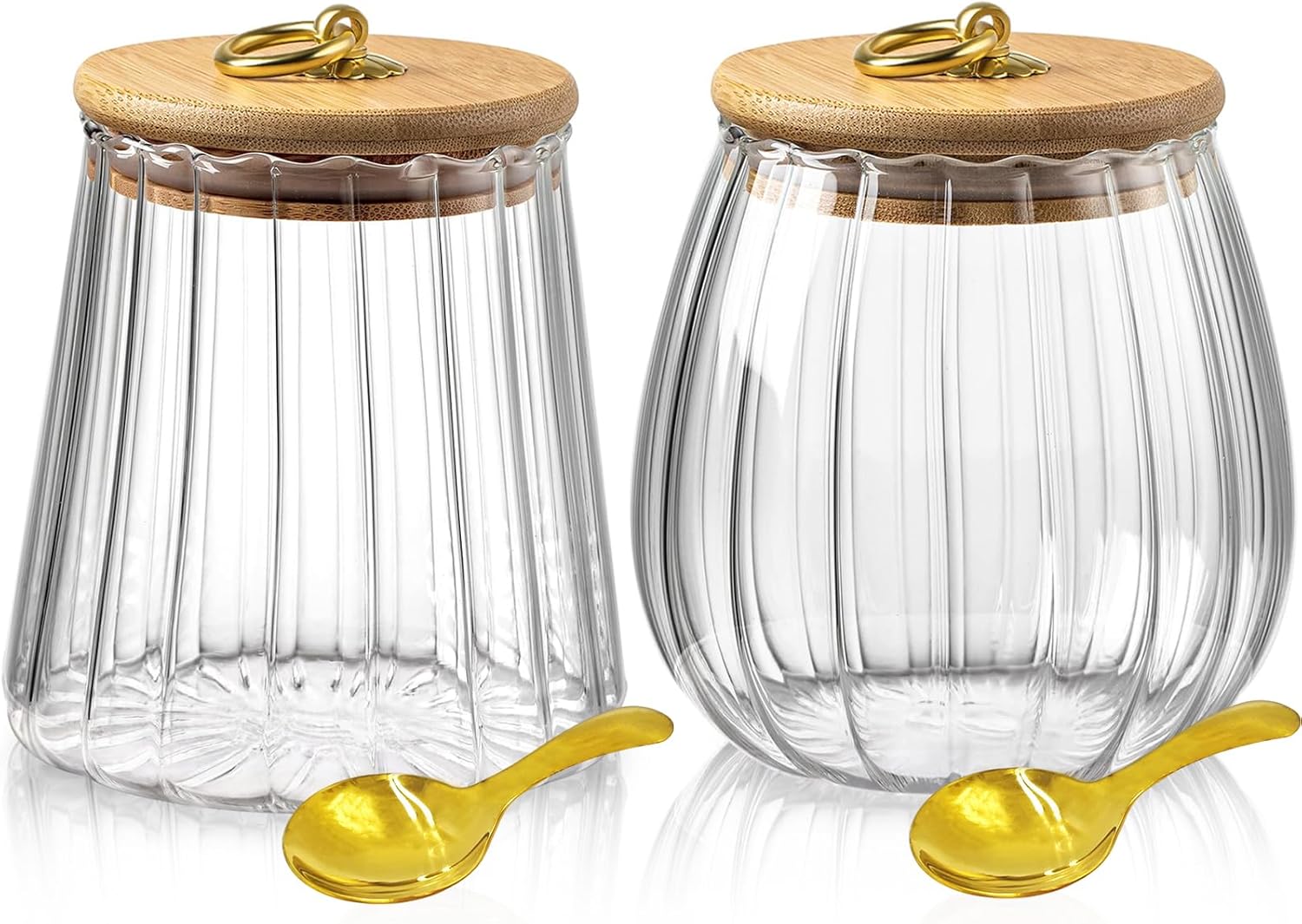 • 💎【Package Contents】-----You will get 2PCS (22 & 25 FL OZ) glass food storage jars with lids and 2 gold spoons. Dimensions for the Oval Glass Jar: 11.5cm (4.5'') X 11cm (4.3'') X 8.5cm (3.3''); Taper Glass Jar: 11.5cm (4.5'') X 11cm (4.3'') X 8.5cm (3.3''); Opening for both Jar: 8.5cm (3.3''),easy to store and take food.