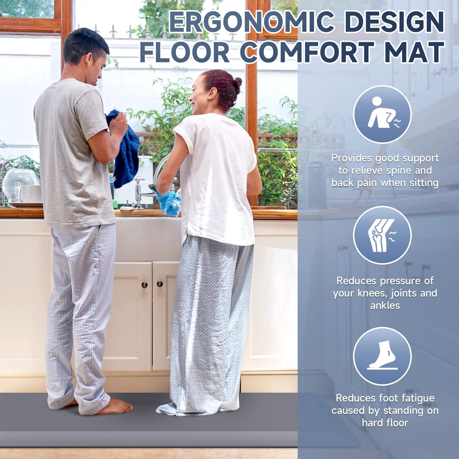 • 【Anti-Fatigue】Comfort floor mat provides comfort when standing. Reduces pressure on knees and ankles. Relieves back and spine pain when standing and relieves fatigue caused by standing for long periods