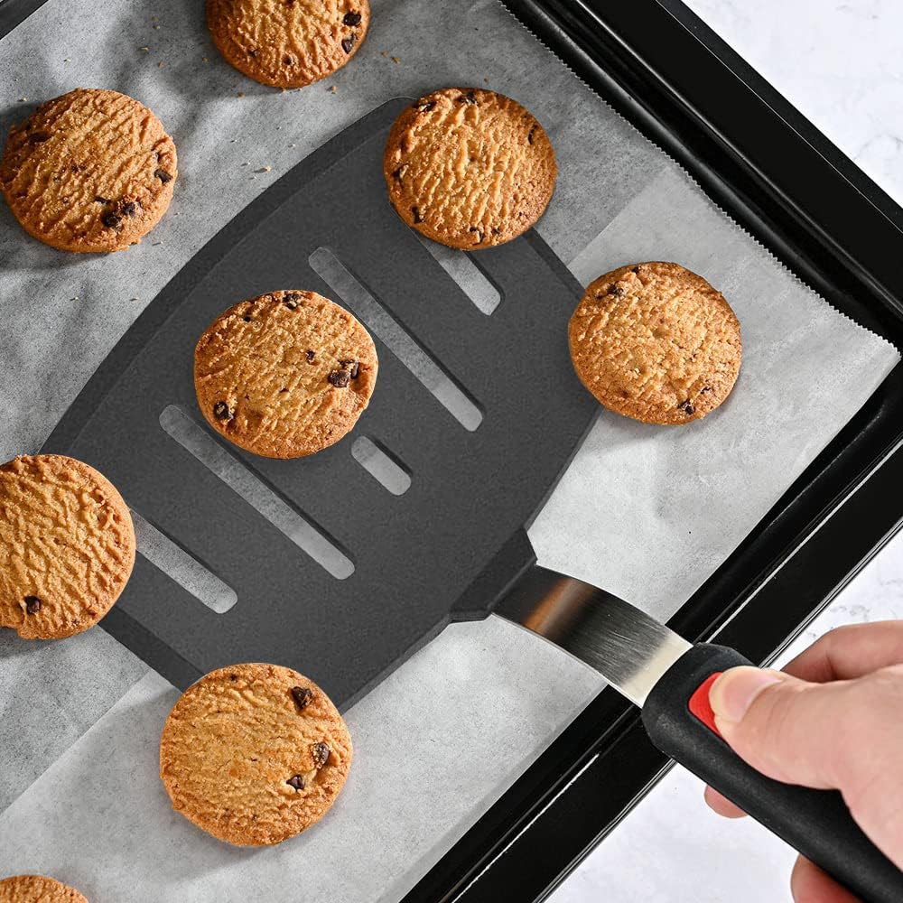 • 🥕The kitchen spatula have thin and hard blade edges make cooking easier and glides easily beneath most foods.The large spatula is sleek, comfortable to hold, and perfectly medium sized for a multitude of uses in your kitchen.