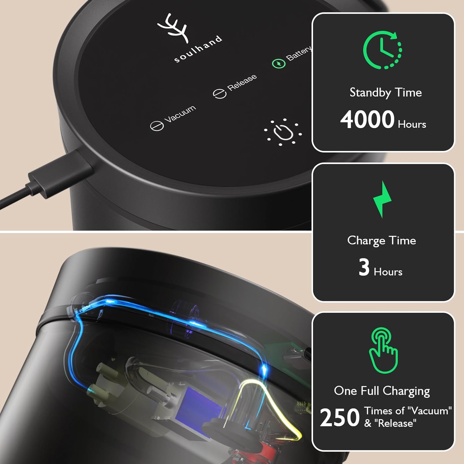 • SMART & SUPER-LONG STANDBY: No manual twisting or pressing is needed to activate the vacuum seal! Our coffee canister can remove air by tapping the top of the lid. It fully charges in 3 hours and can continuously turn on and off 300 times and last for 6 months. Soulhand coffee storage container's unique automatic sealing system will constantly monitor the air pressure inside the container and automatic air exhaust. (NOTE: Use the charging cable that comes with the coffee canister).