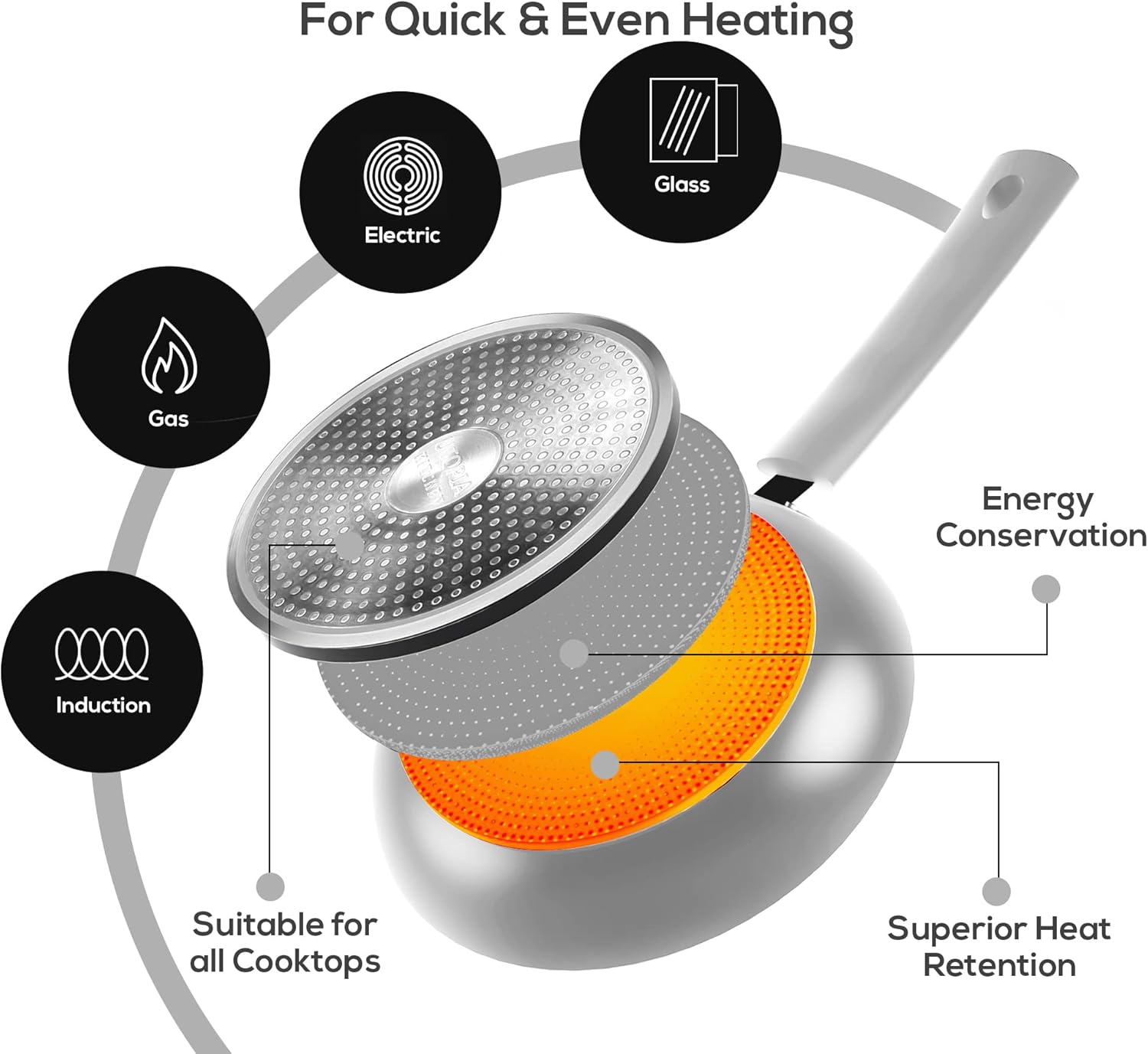 • SPICE UP YOUR COOKING AURA – The wobble-free bakelite handles are artistically designed and firmly riveted to the pans, for safety and comfort.