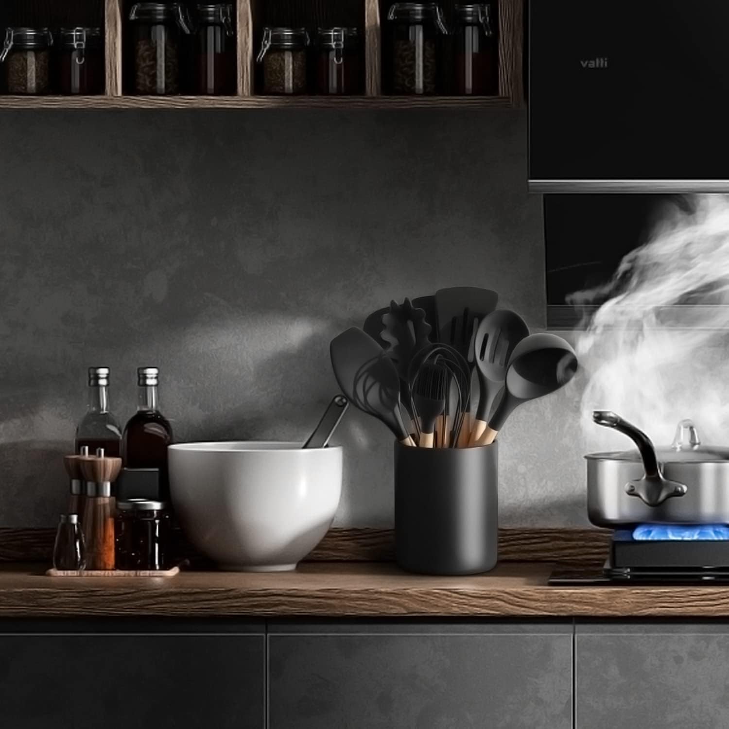 • [ Multifunctional utensil jar ] Matte black utensil holder for countertop suitable for small and medium cookware, keeping cutlery at your fingertips. Black utensil holder for kitchen counter can also be used as an ornament to store and decorate kitchen accessories