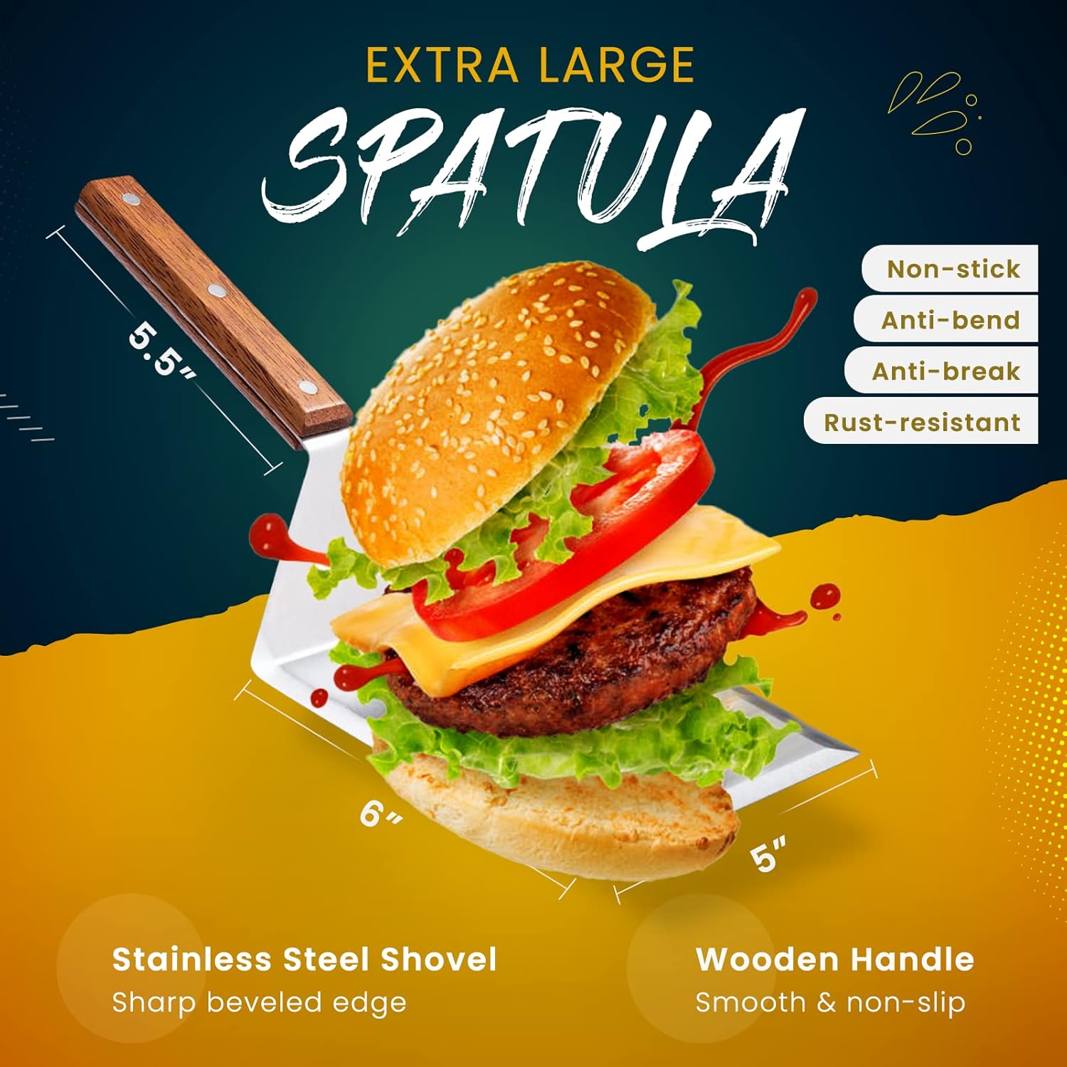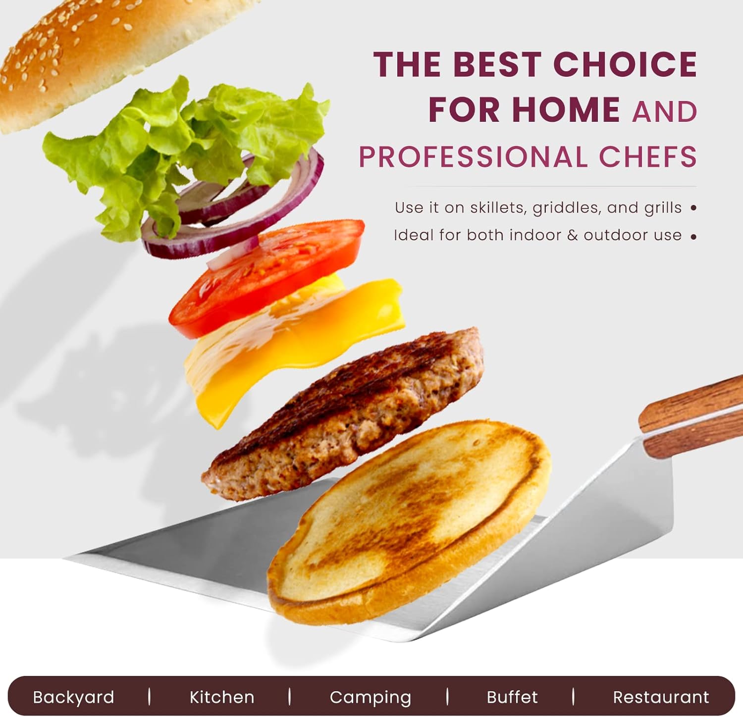 • ✅VERSATILE AND MULTIFUNCTIONAL: Our extra-wide spatula turner is a versatile kitchen companion. Perfect for grilling, BBQ, and as a griddle accessory for cast iron or flat-top cooking. The beveled edges of our oversized spatula seamlessly slide for a quick and east flipping burger, cutting pizza, or serving meat and cakes. Whether you're a grilling novice or a seasoned professional, this spatula is the ideal griddle grilling accessory for backyard BBQs and more.