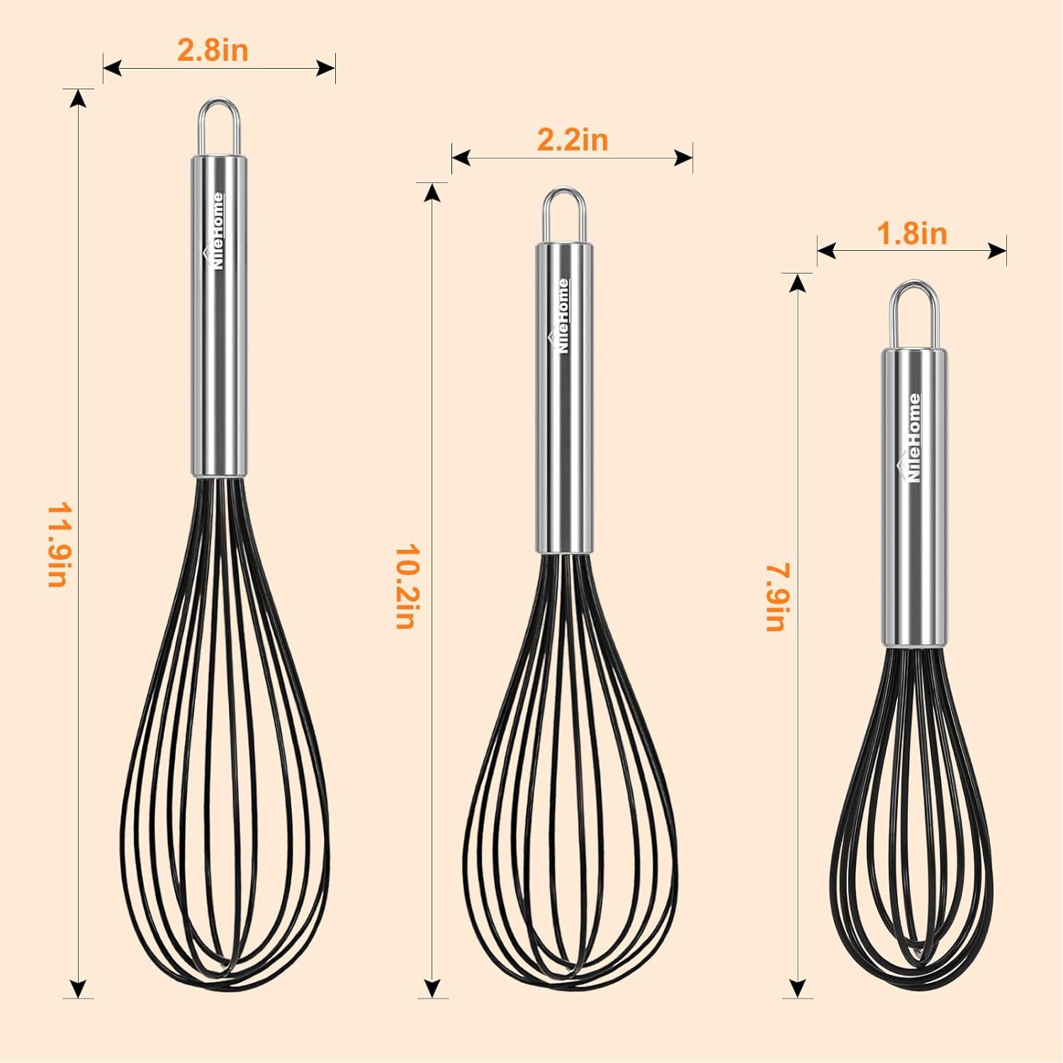 NileHome Whisk Commercial Whisks Stainless Steel & Silicone Non-Stick Coated Small Whisk Set 8" 10" 12" Kitchen Wisk Wire Whisks for Cooking 3 Pack, Black