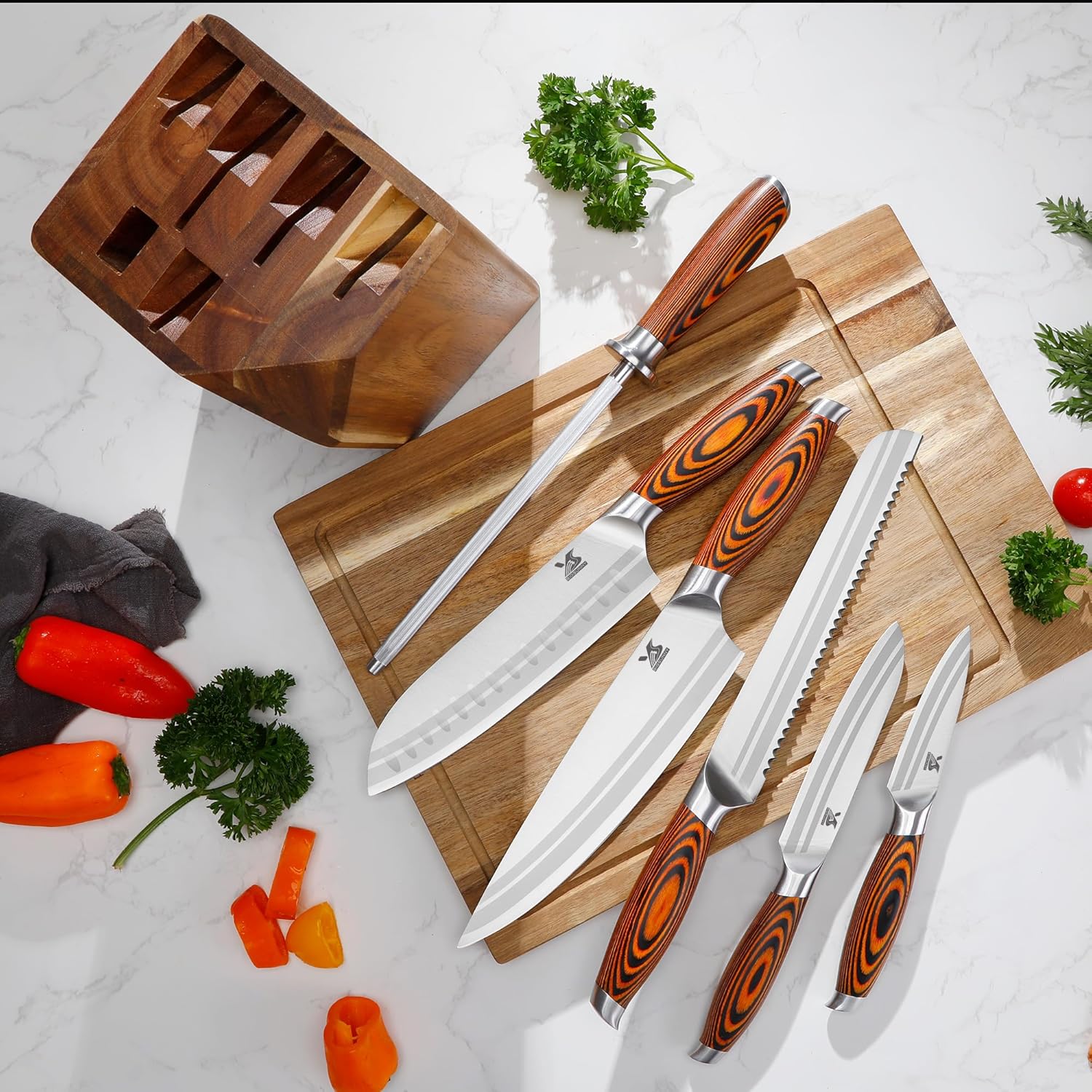 MSY BIGSUNNY 7pcs Knife Block Set, German Steel Chef Knife Set, Precious Pakkawood Handle for Kitchen Knife Block Set