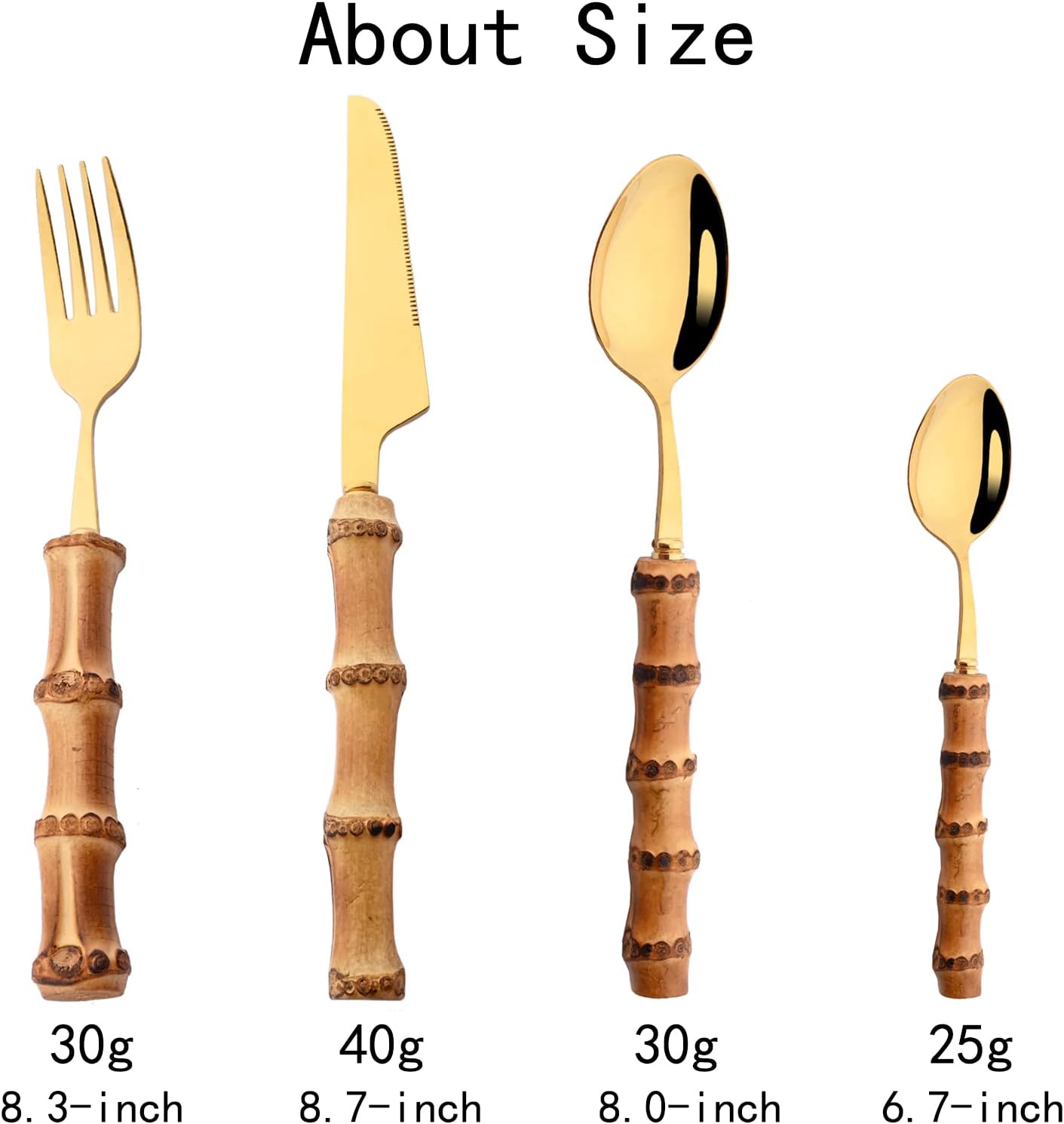JASHII 16 Pieces Bamboo Handle Silverware Set Natural Bamboo Stainless Steel Flatware Cutlery Utensils,Service for 4, Include Knife Fork Spoon Teaspoon. - Bamboo Gold