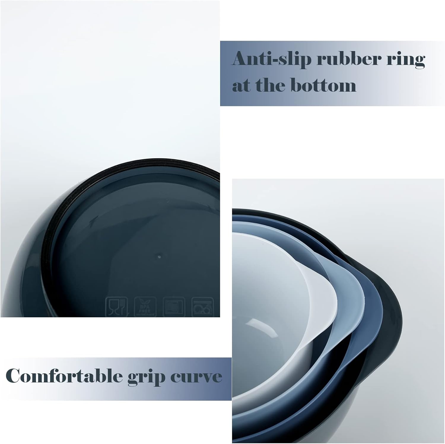 • [Non-slip & non-stinky] -The rubber layer at the base will keep these batter bowls from skidding or slipping during mixing. Ingredients won’t stick with the bowl’s non-stick surface, making lengthy mixing less tiring.