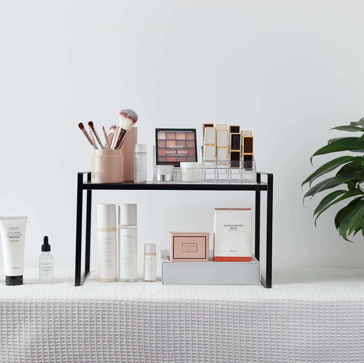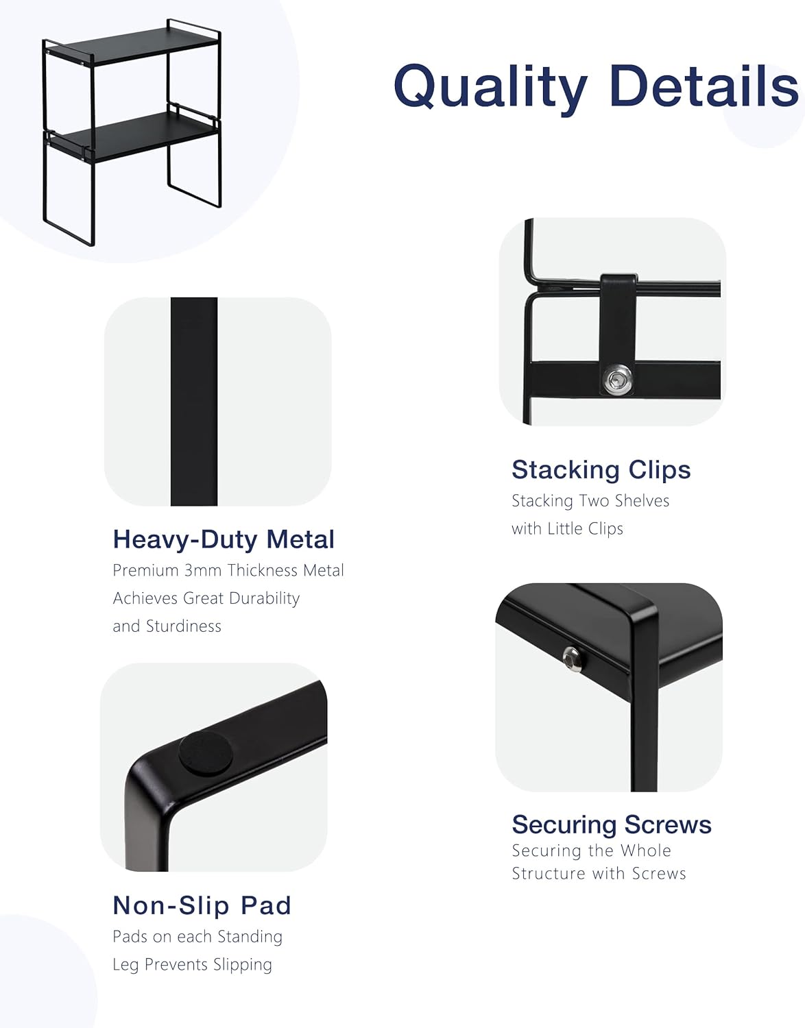 • CHARACTER DESIGN: This cabinet shelf can create plenty of space for your household items such as cups, pots, bottles, bowls, cookware, or canned foods without dominating space in your cabinet. This stylish cabinet shelf fits neatly on the countertop to keep your essentials organized and easily accessible.