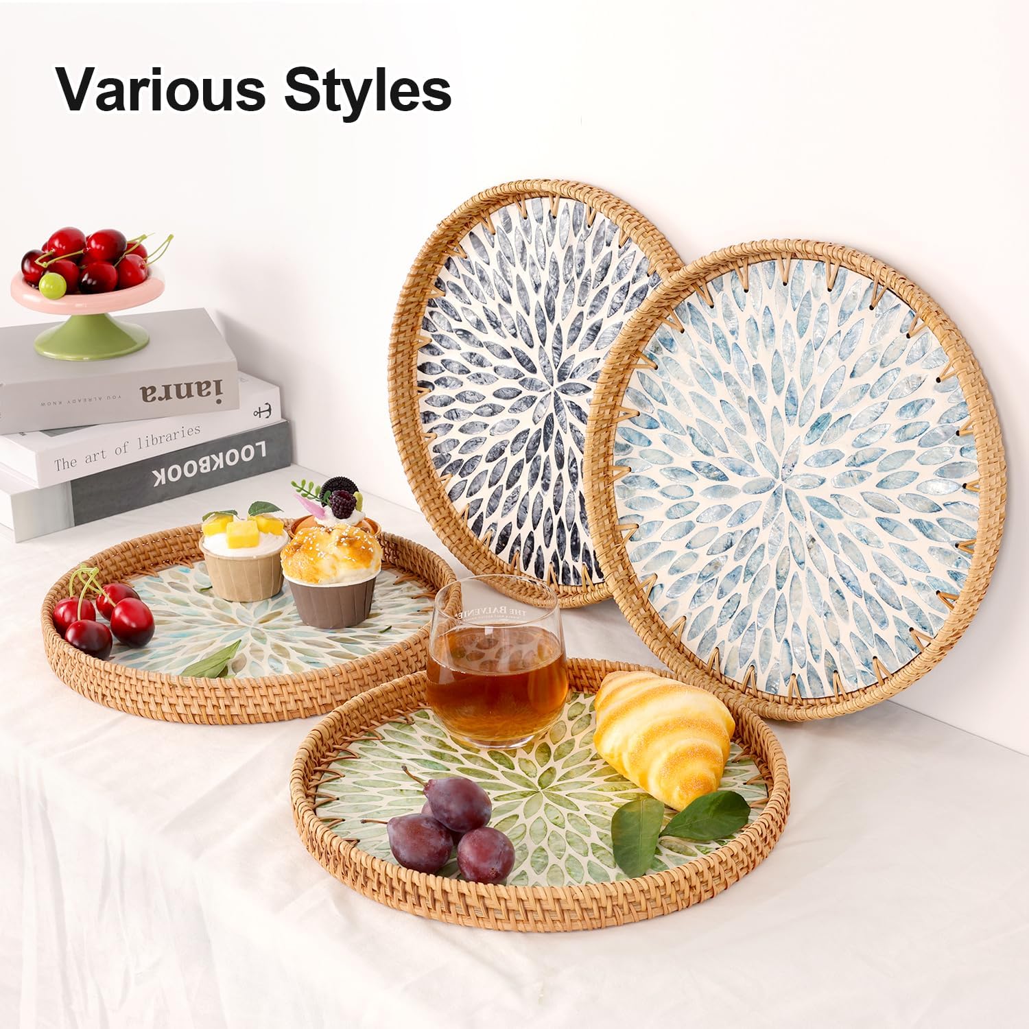 Round Rattan Tray with Mother of Pearl Inlay, Rattan Serving Tray for Coffee, Bread, Fruits, Decorative Wicker Tray for Table Decor, Home Decor, Kitchen Island Decor (Green Leaf, 11.8")