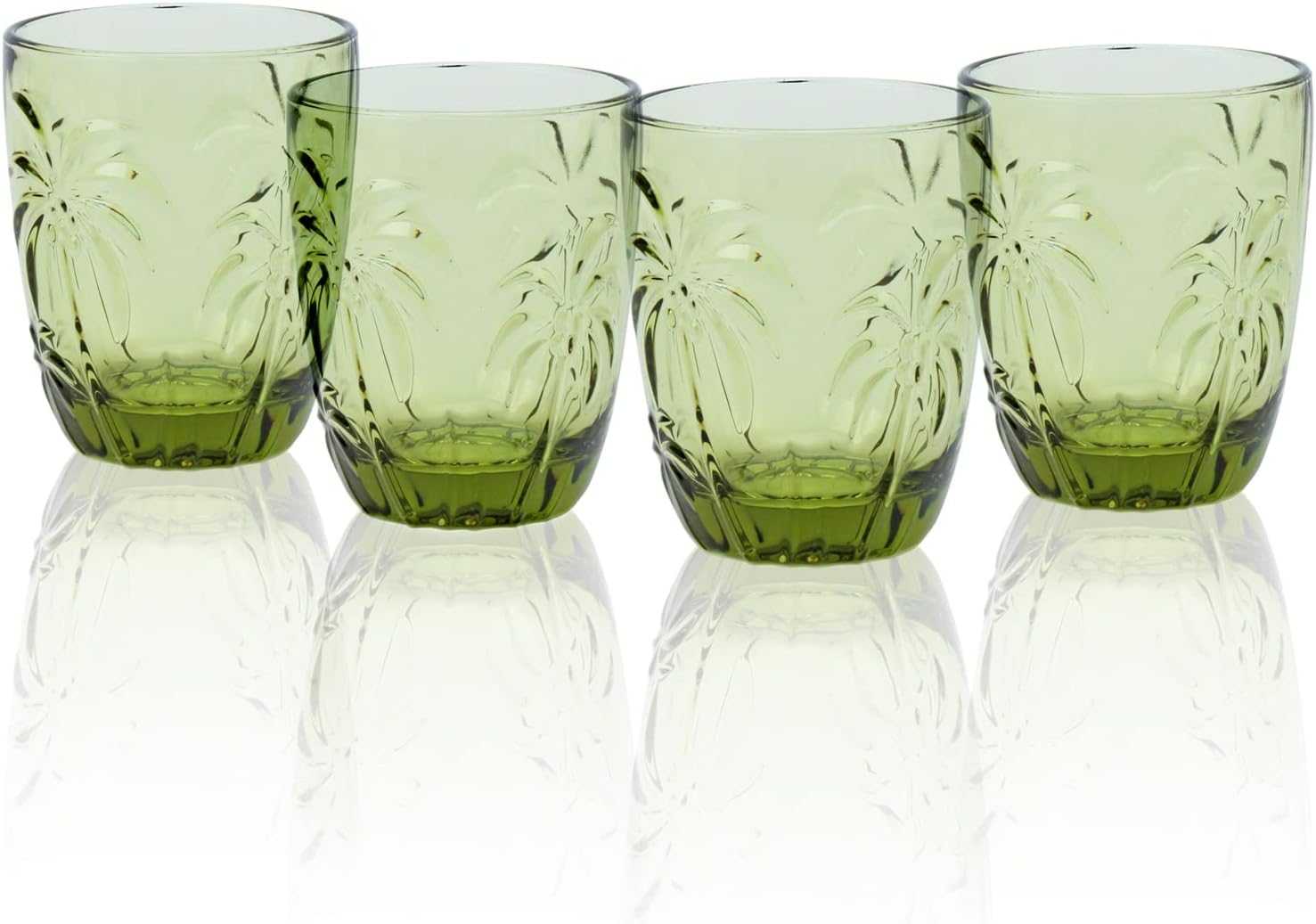 • SET INCLUDES - 4 x 9 oz. embossed glass tumblers with a raised tropical design. Super sturdy and durable glasses with a heavy base that are easy to hold. Designed from color glass, that will not fade.