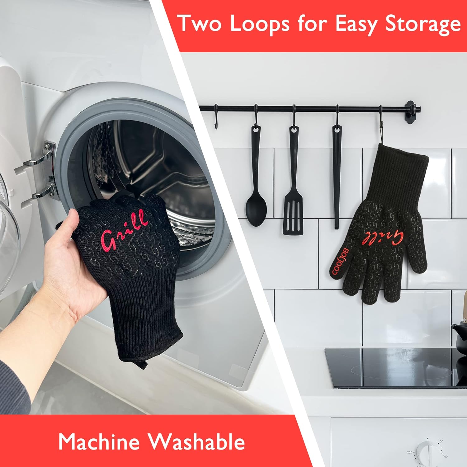 COOLJOB Heat Resistant BBQ Gloves for Hot Temperature Cooking, Barbecue Grilling or Baking Bread Pizza, 800 Degrees Safe Oven Mit with Fingers, Aramid Fiber with Silicone Grip, One Size, Black