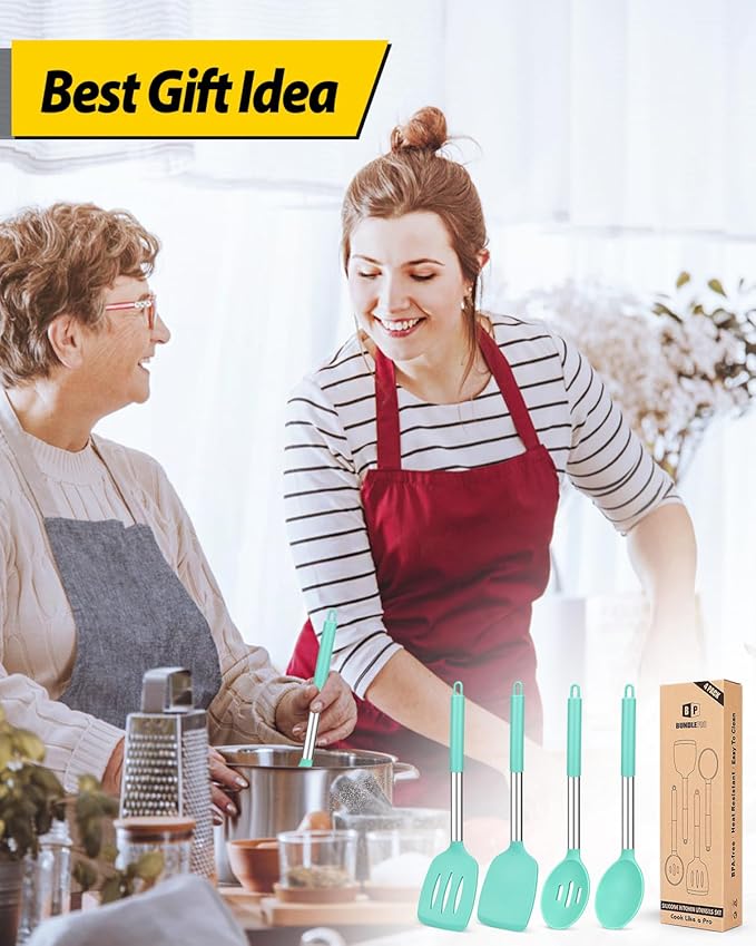 Pack of 4 Silicone Cooking Utensils Set, Non Stick Large Solid Spatulas, Heat Resistant Blue Slotted Spoons, Ideal BPA Free Kitchen Turners for Frying, Mixing,Serving,Draining,Turning,Stirring