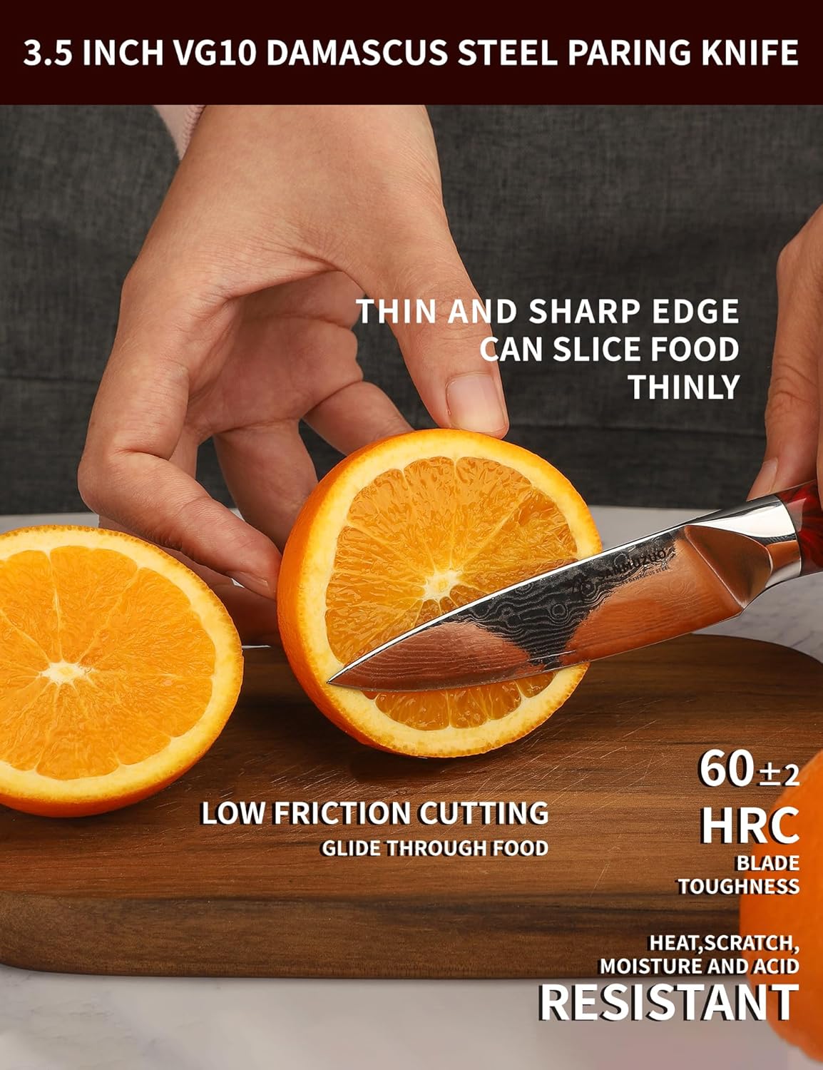• Premium Blade: This is a paring knife type, the precise spear point blade is made of 67 layers of Damascus steel, the core layer is VG10 material, wrapped by 33 layers of high-quality high-carbon stainless steel layers on each side to ensure excellent strength, toughness and durability. The polished surface can minimize drag for jelly-smooth cuts and enhanced non-stick performance
