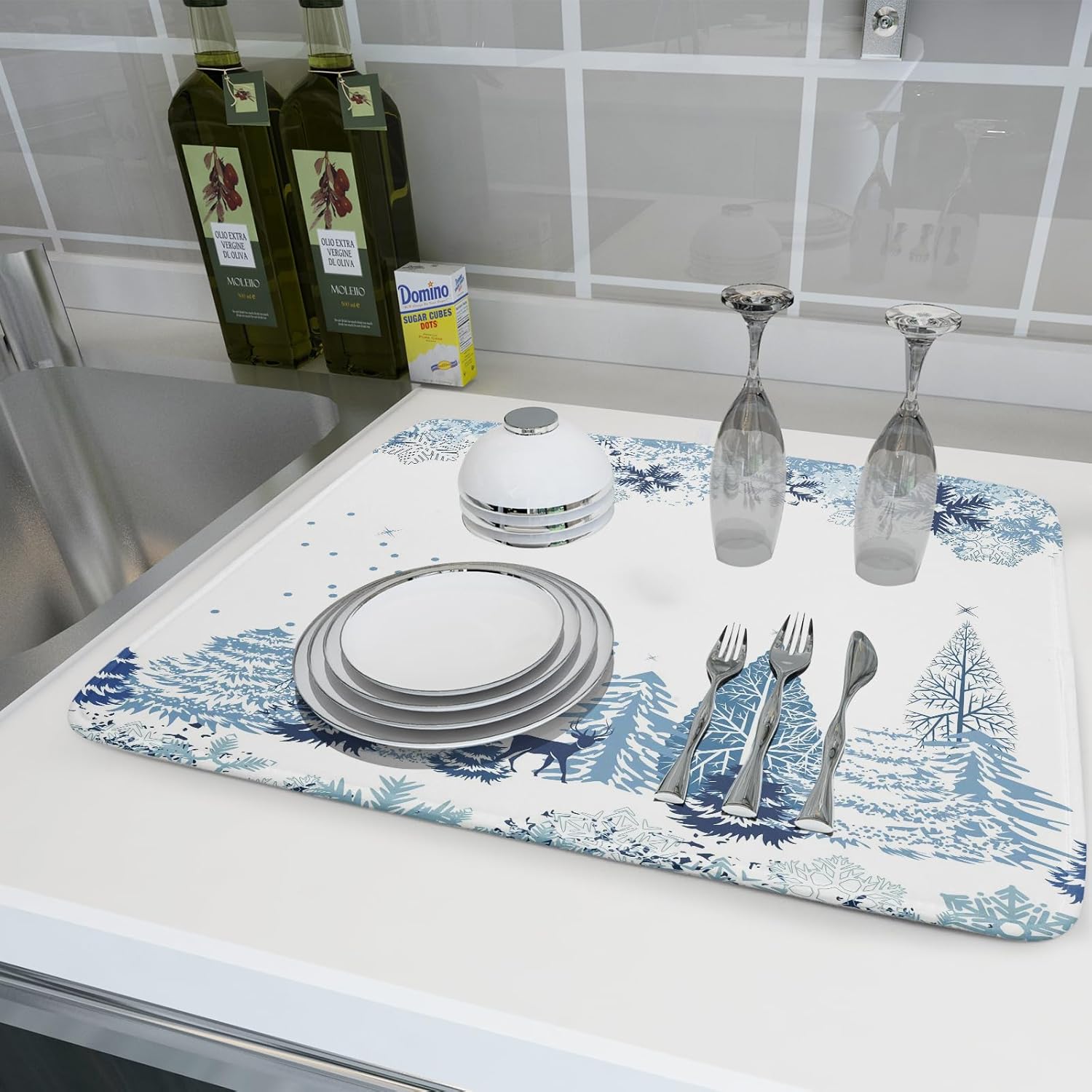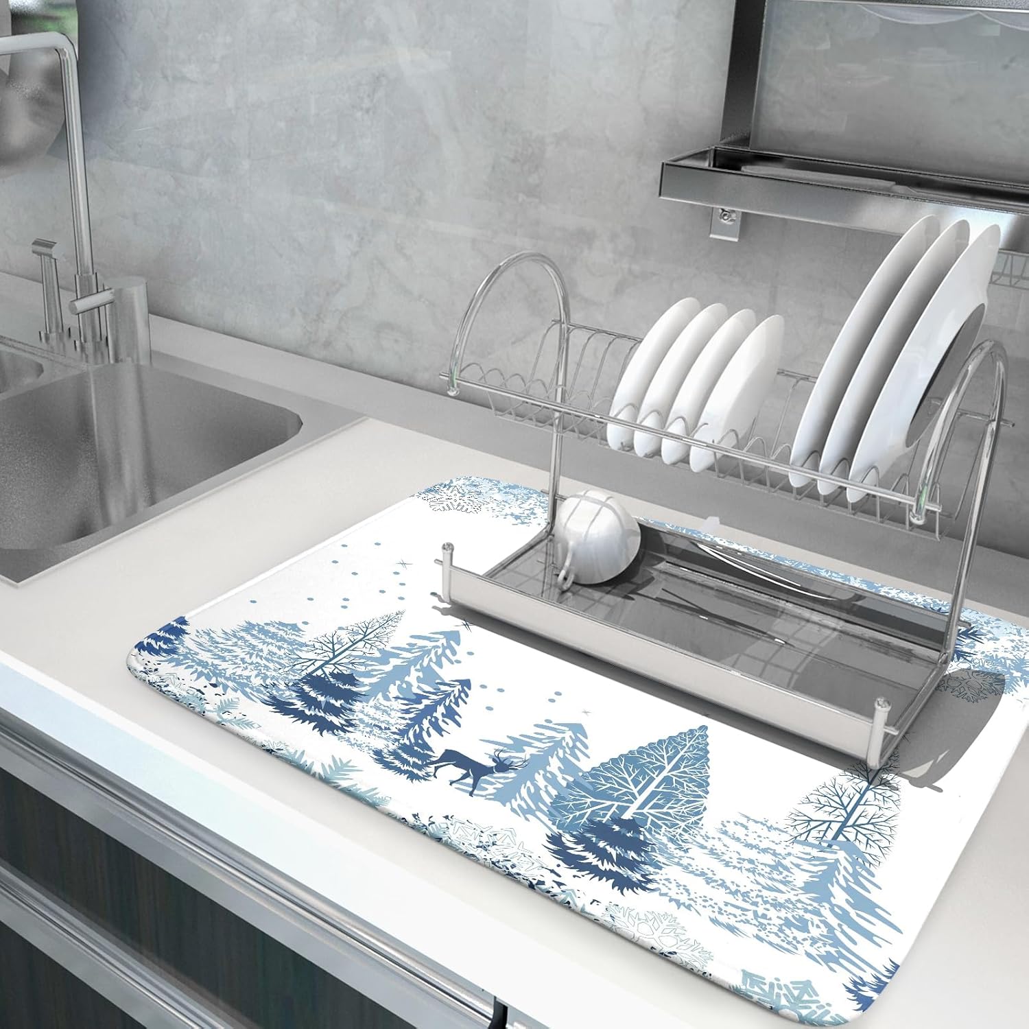 • ❀ 【HIGHLY ABSORBENT, QUICK DRYING】 With the middle made of composite sponge, microfiber terry cloth on the reversible side absorbs 4X its weight in water, which easily keeps your counter dry. Use alone or pair with a dish drainer. Our ultra Winter Forest absorbent Dishes Pad will suck up all the left wetness from your pots, pans, and dishes, and leave the underside both dry. Our slip-resistant backing adds stability when drying stemware or other delicate items.