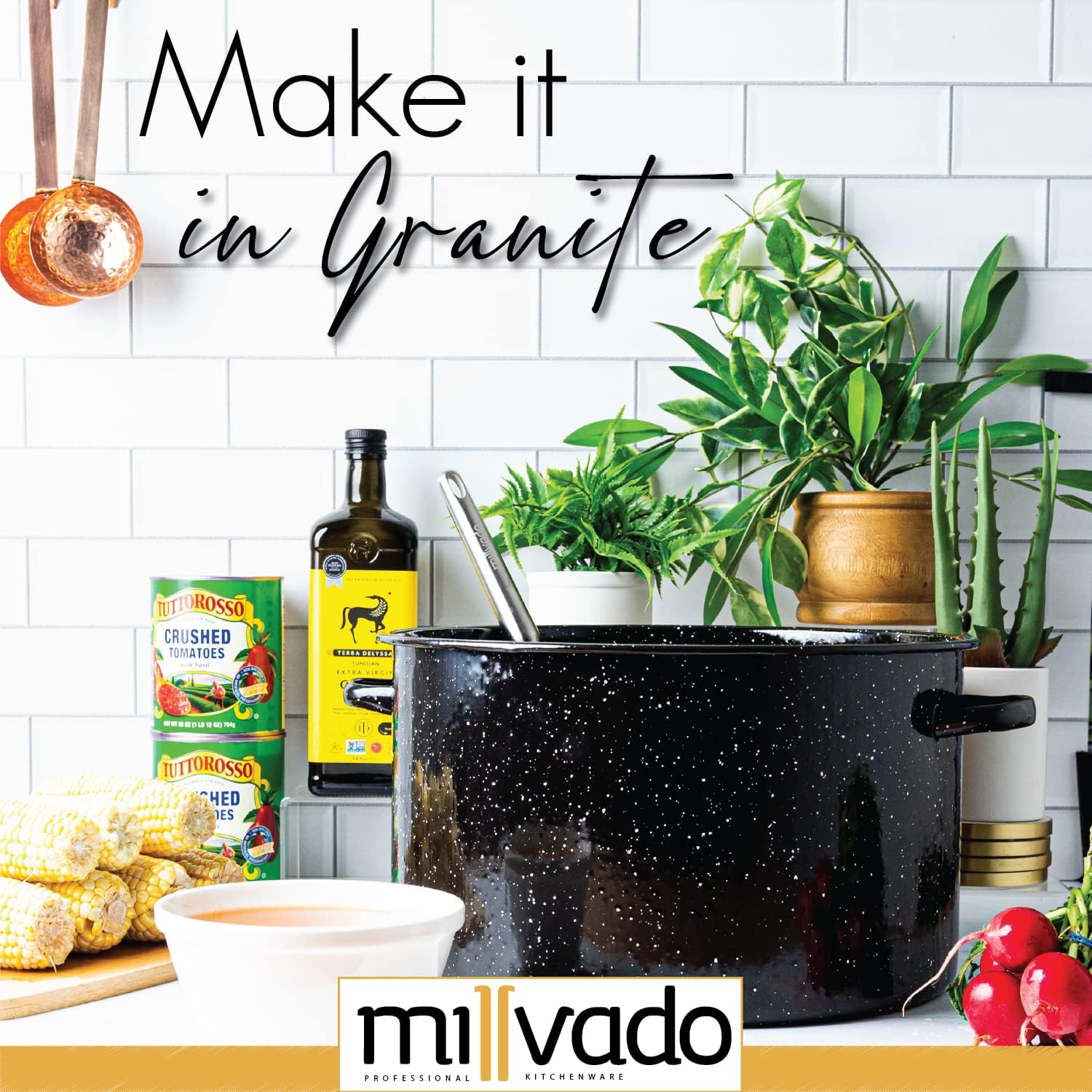 • NATURALLY NONSTICK: Stock pots are carefully crafted with a core of carbon steel, then covered on the inside and outside with a layer of natural enamel. With these black and white speckled stoneware pots, you get the benefits of non stick without having to worry about chemicals! Does not react to acidic foods, either.