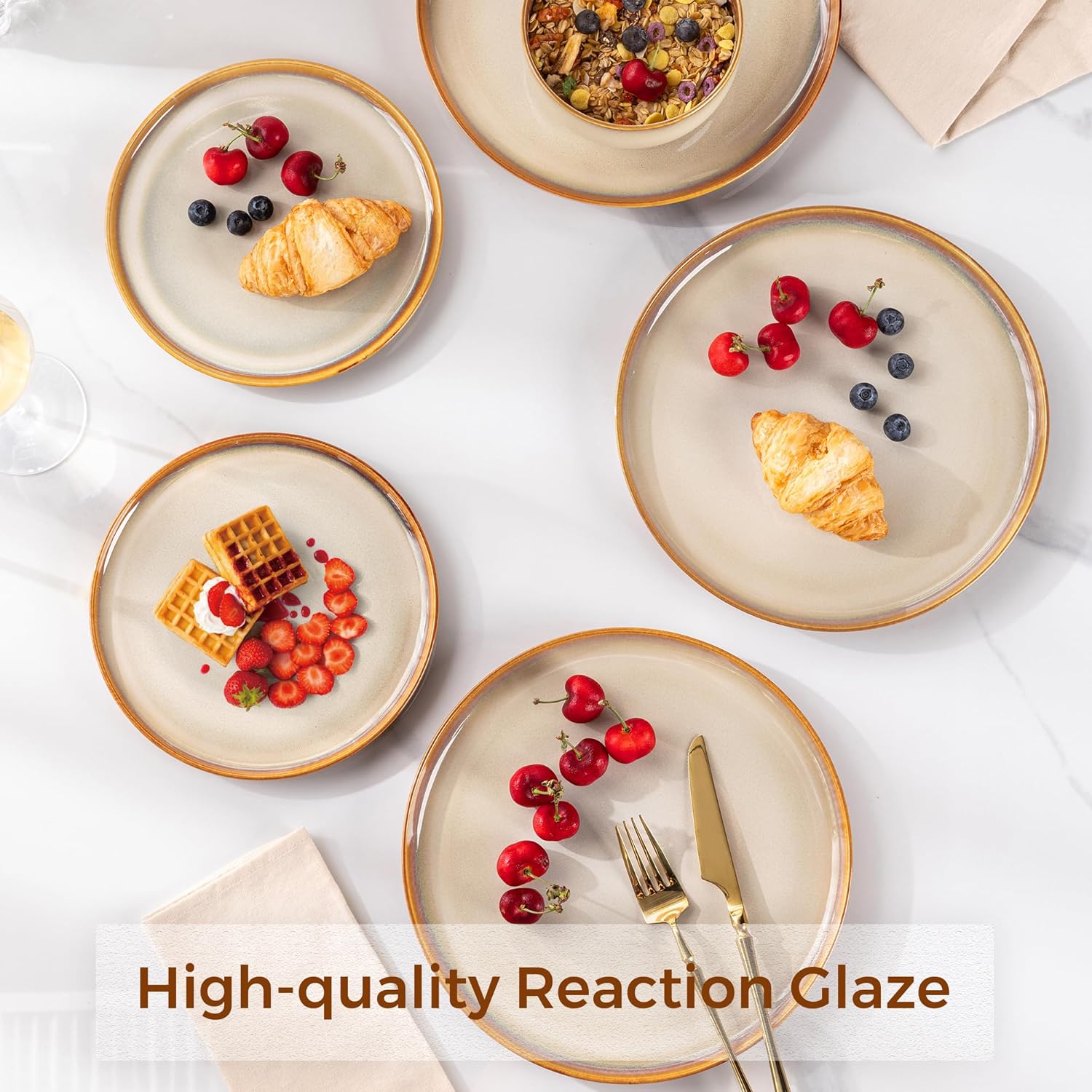 • 【UNIQUE AND SCRATCH RESISTANT】 Our plates are fired with two different glazes,The reactive glaze make every plate is unique,Since our glaze is all-natural reactive finish, the surface of plates would change color on lighting,So Our glaze is also extra strong to prevent scratches from your knives and forks .